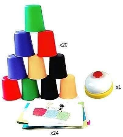 لكل لاعب 6 اكواب و بنسحب كارت والمفروض ننفذ ترتيب الالوان اللى فيه بالاكواب اللى معاه واللى يخلص اسرع بيضغط على الجرس .. وهكذا لحد لما نخلص الكروت