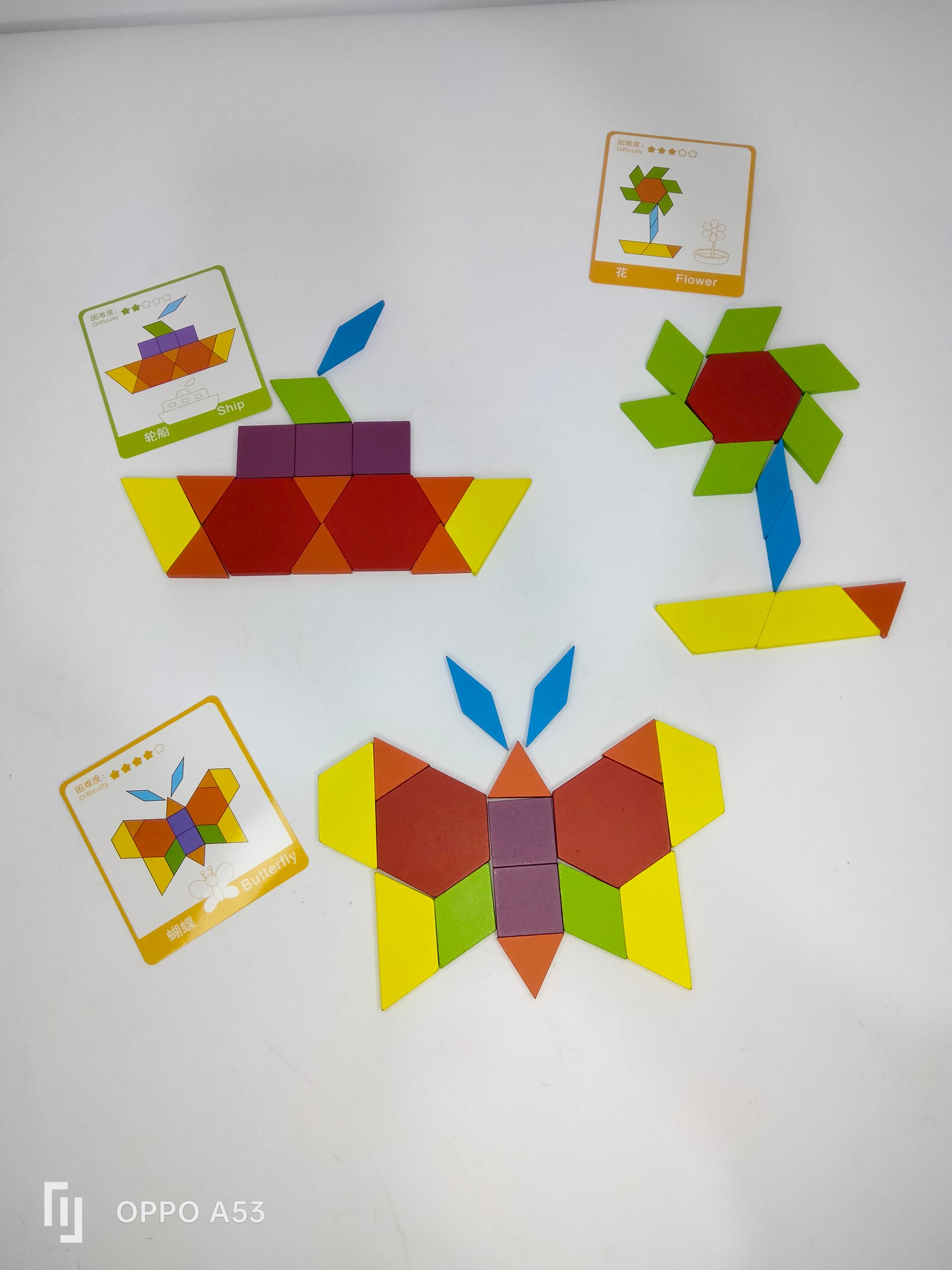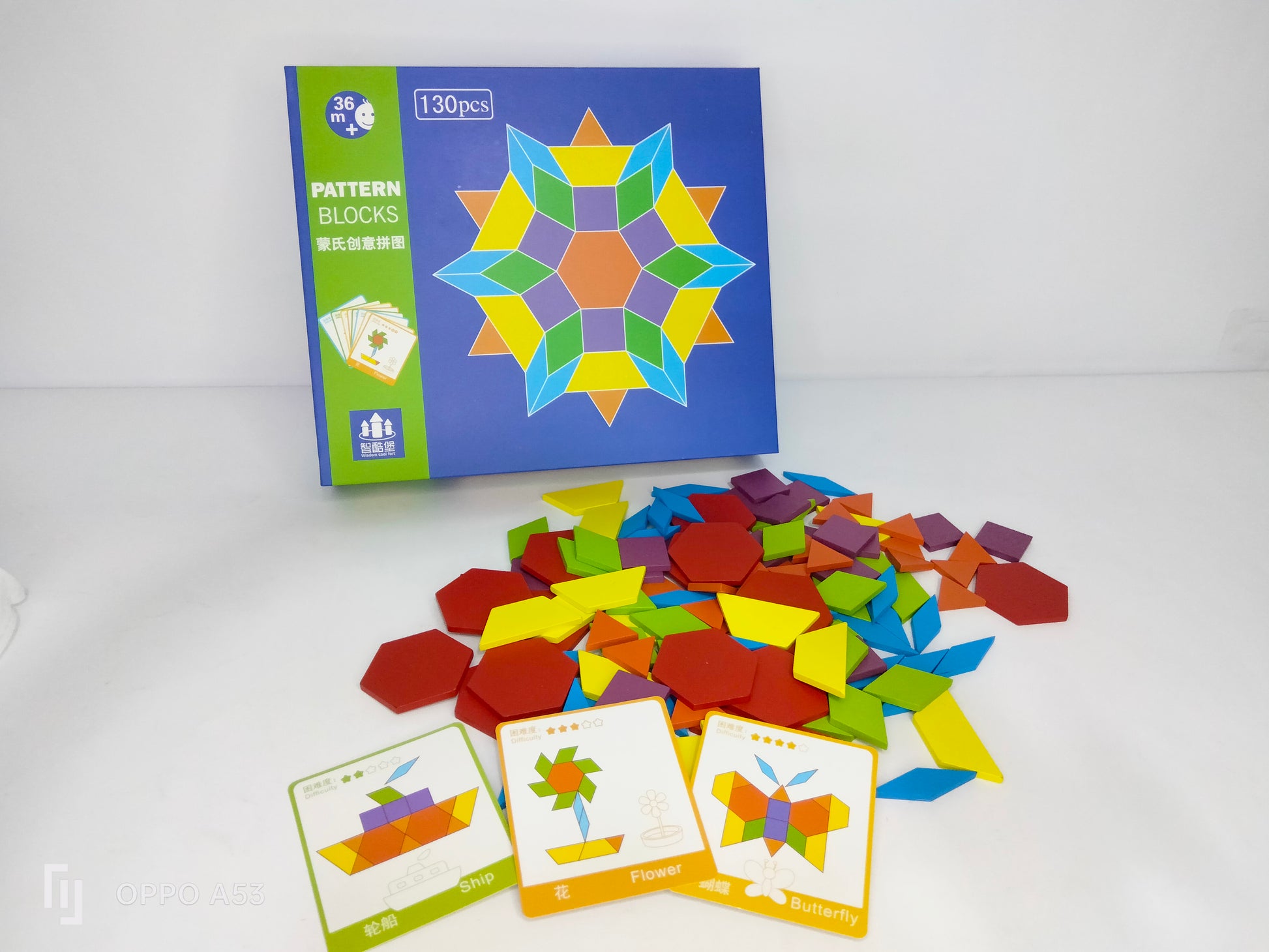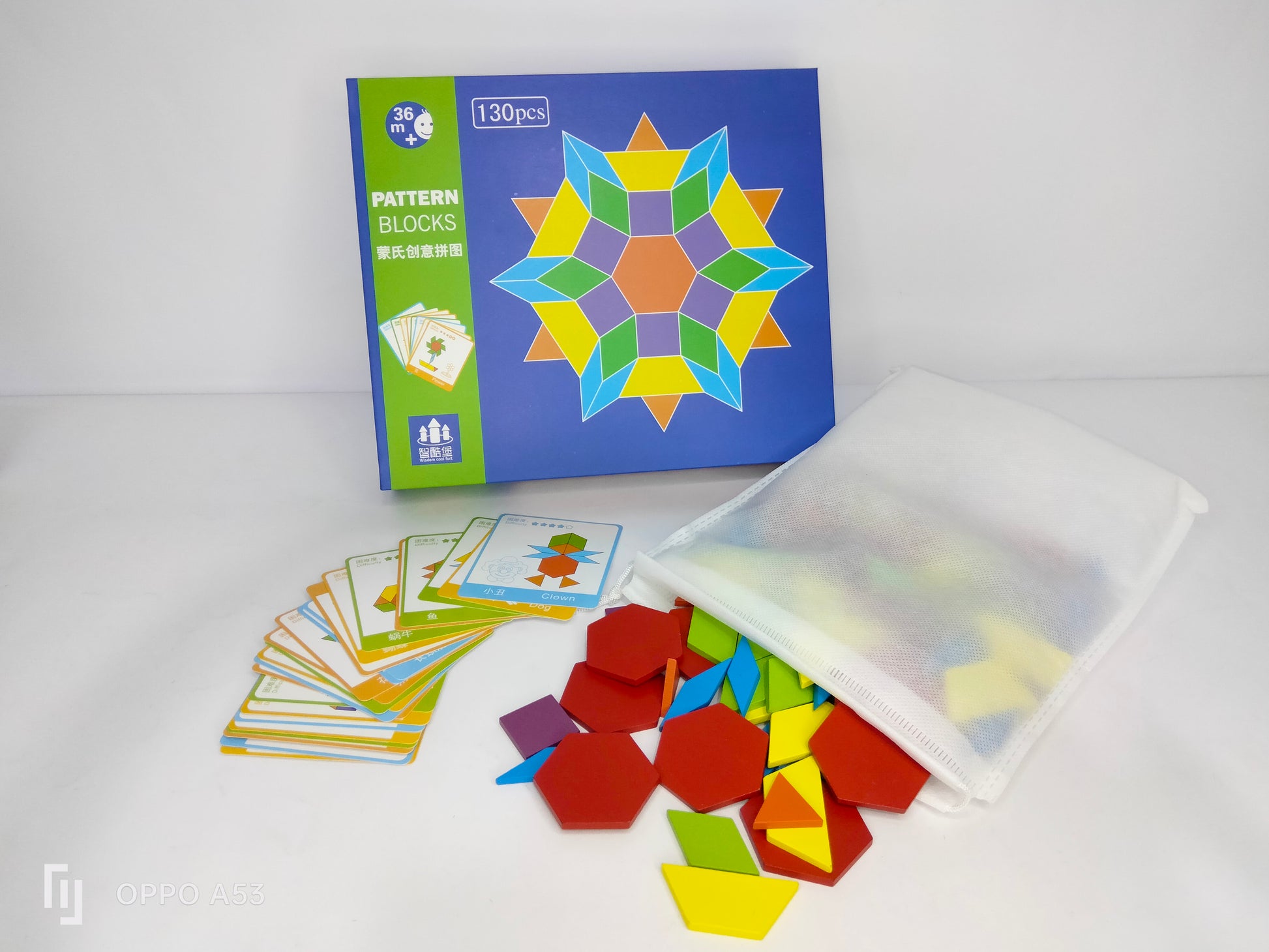 📦 محتويات اللعبة: قطع ملونة بأشكال هندسية مختلفة + بطاقات أنشطة وتحديات متعددة + كيس للتخزين.