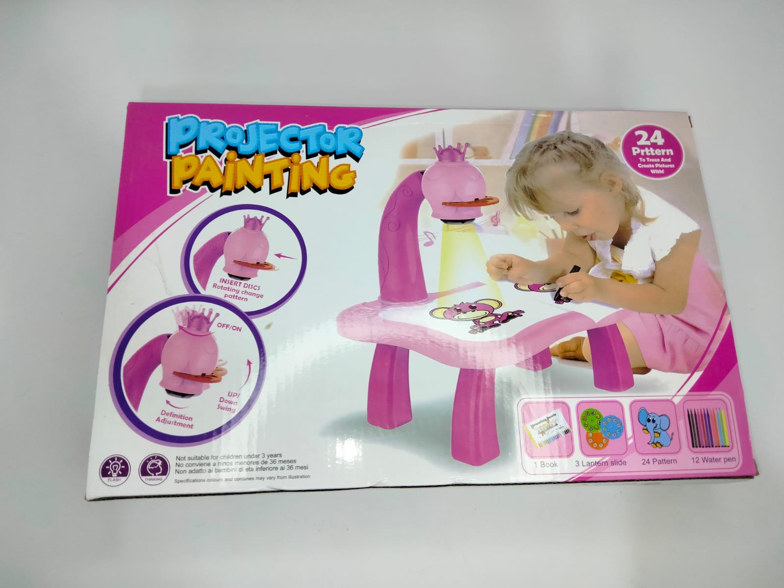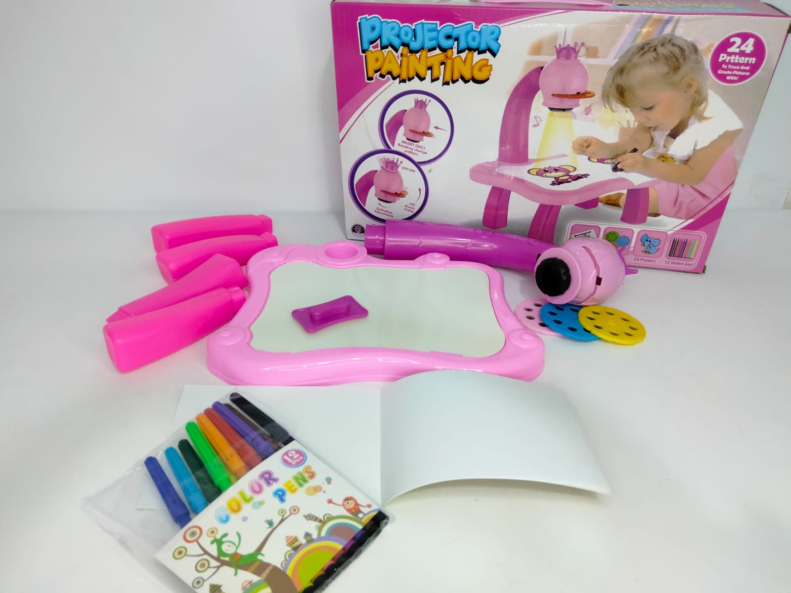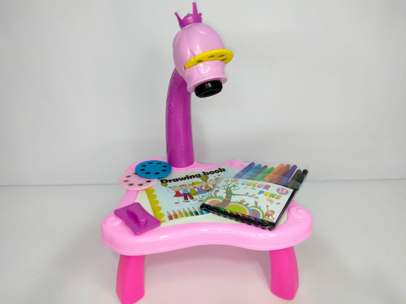 يقوم الطفل بوضع الورقة على الطاولة، يختار الشكل المعروض من البروجكتور، ويبدأ في رسمه وتلوينه بسهولة.