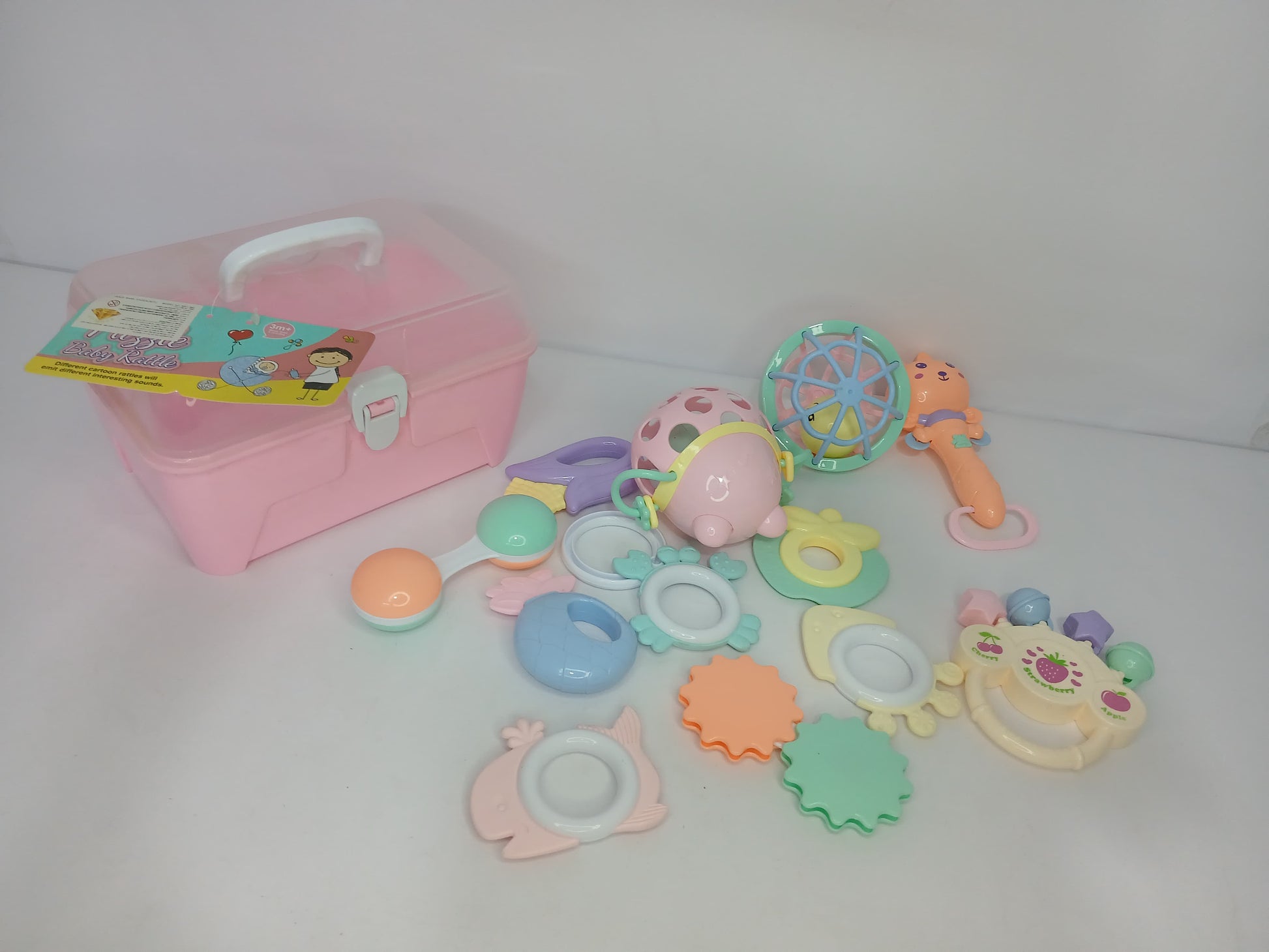 🍼🎶 طقم ألعاب رضع خشخيشات وحلقات تسنين مع علبة تخزين عملية