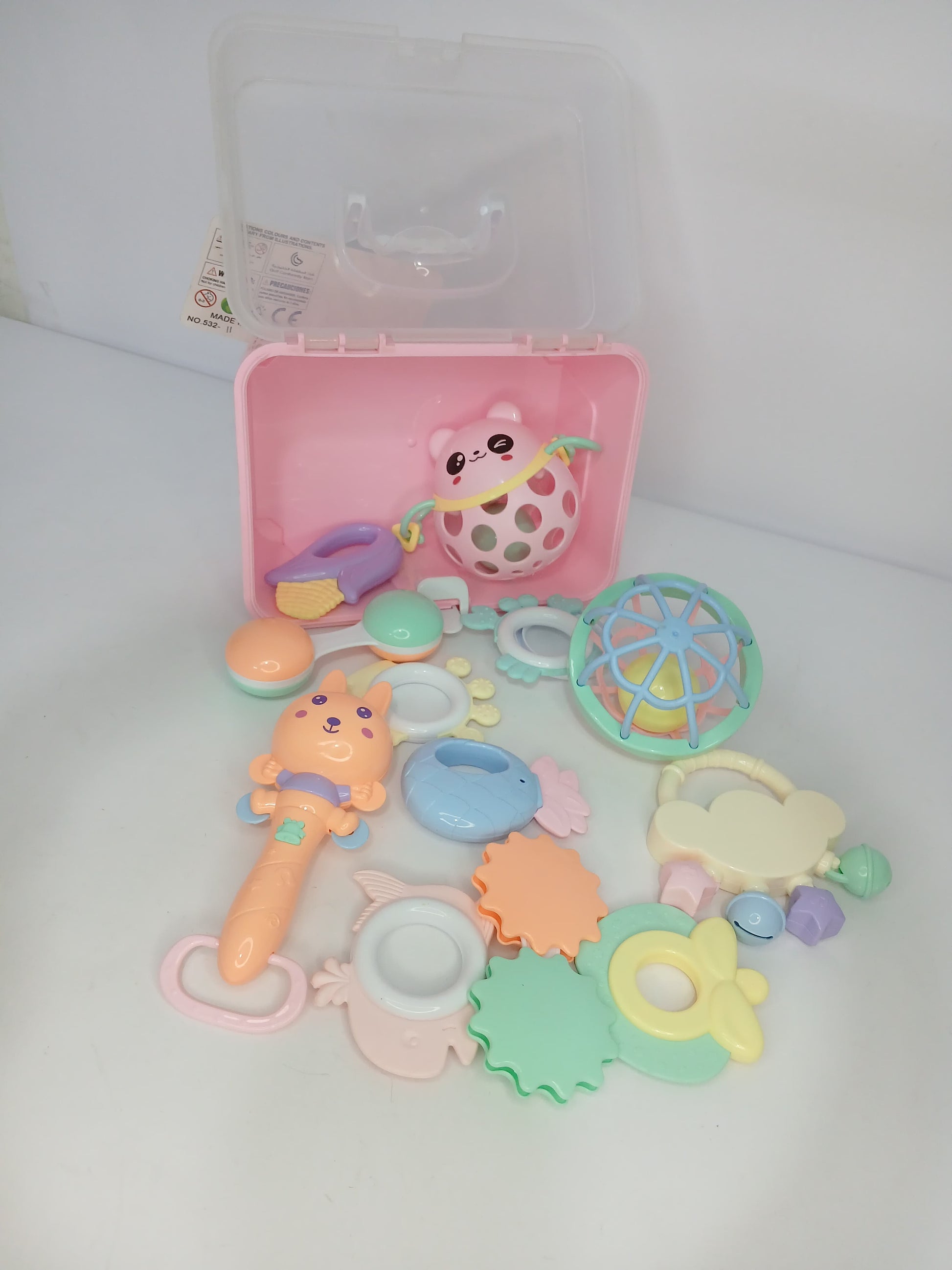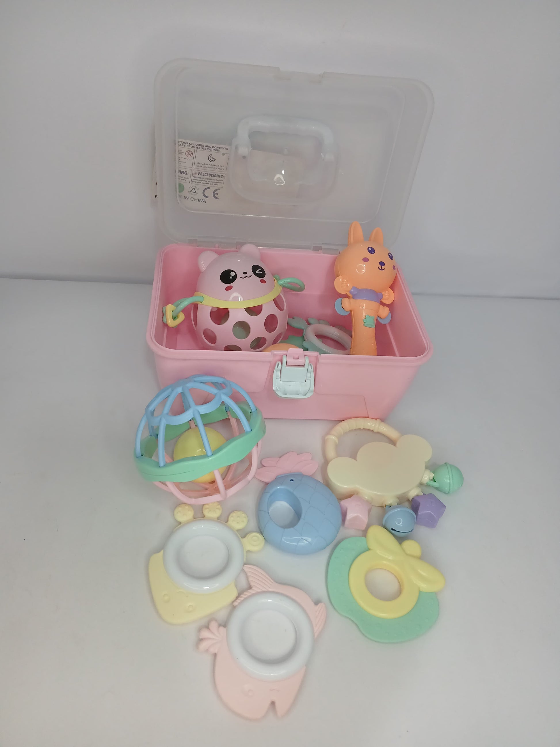يستخدم الطفل الألعاب للإمساك واللعب لسماع الأصوات الممتعة أو لتخفيف آلام التسنين، مع إمكانية حفظها في الصندوق بعد اللعب.