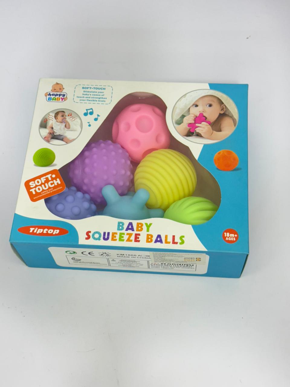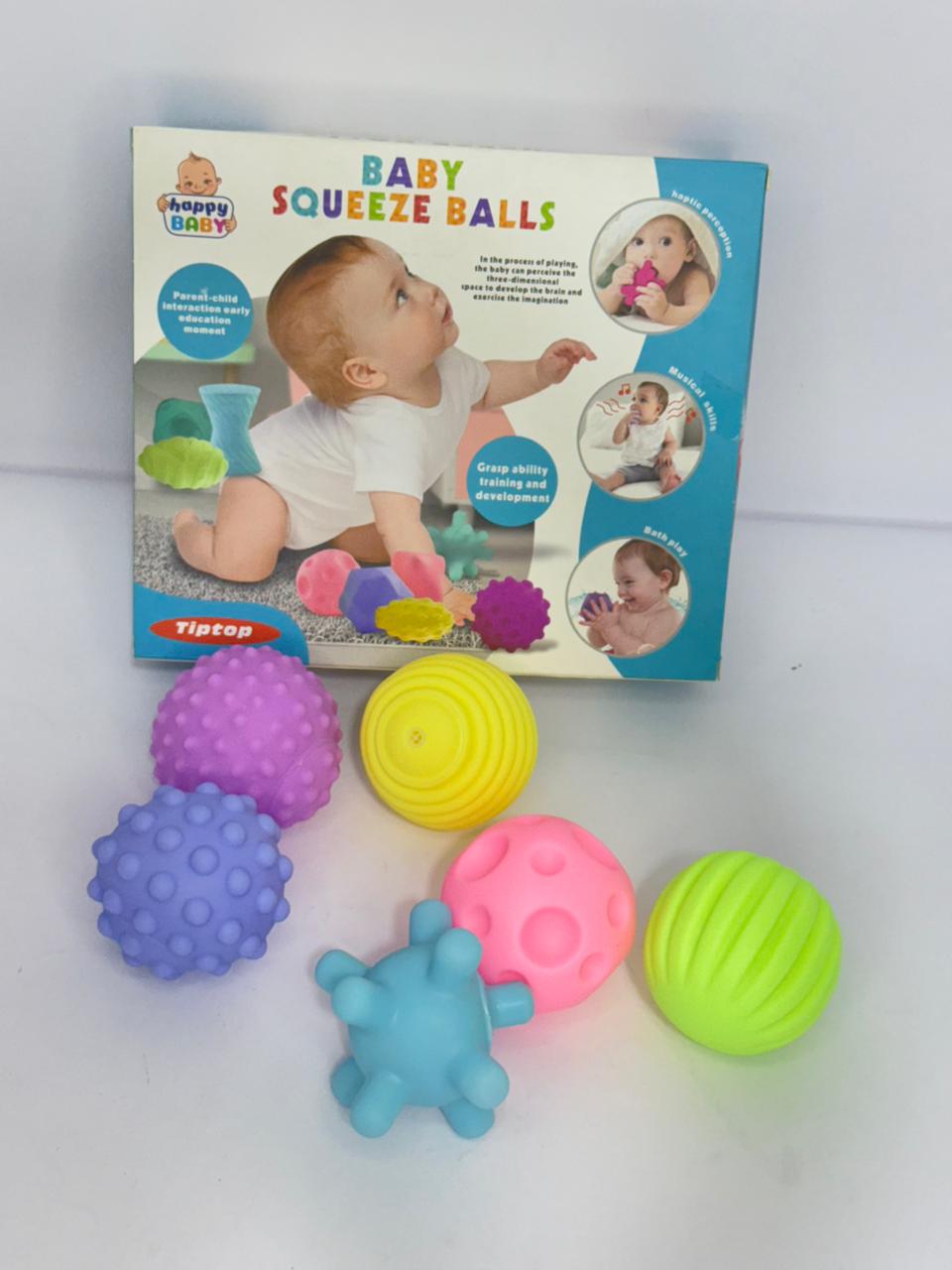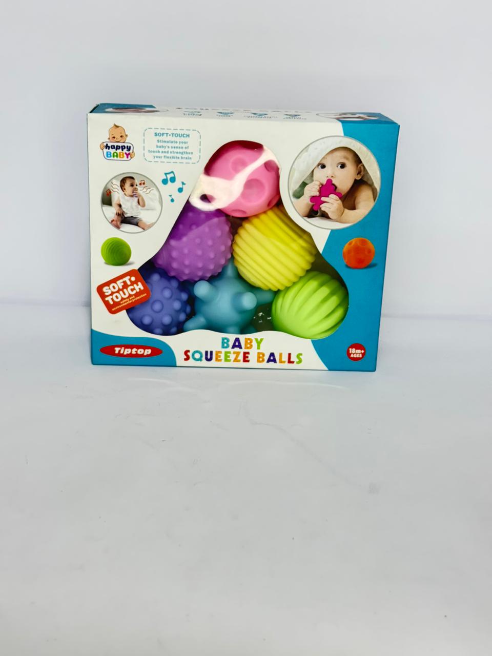 📦 محتويات اللعبة: مجموعة من الكرات الملونة بأشكال وملمس مختلف (ناعمة، بارزة، مضلعة) لجذب حواس الطفل.