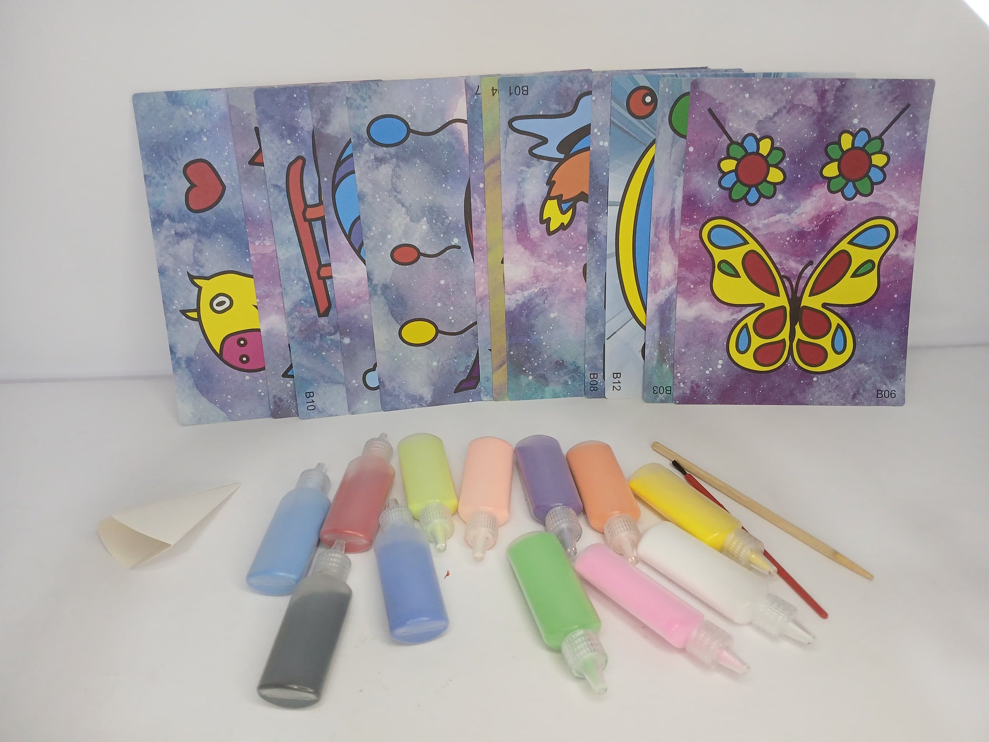 يقوم الطفل بإزالة الطبقة اللاصقة من الأشكال على البطاقة، ثم يرش الرمل الملون حسب ذوقه ليظهر الشكل النهائي بألوان رائعة 🌈.