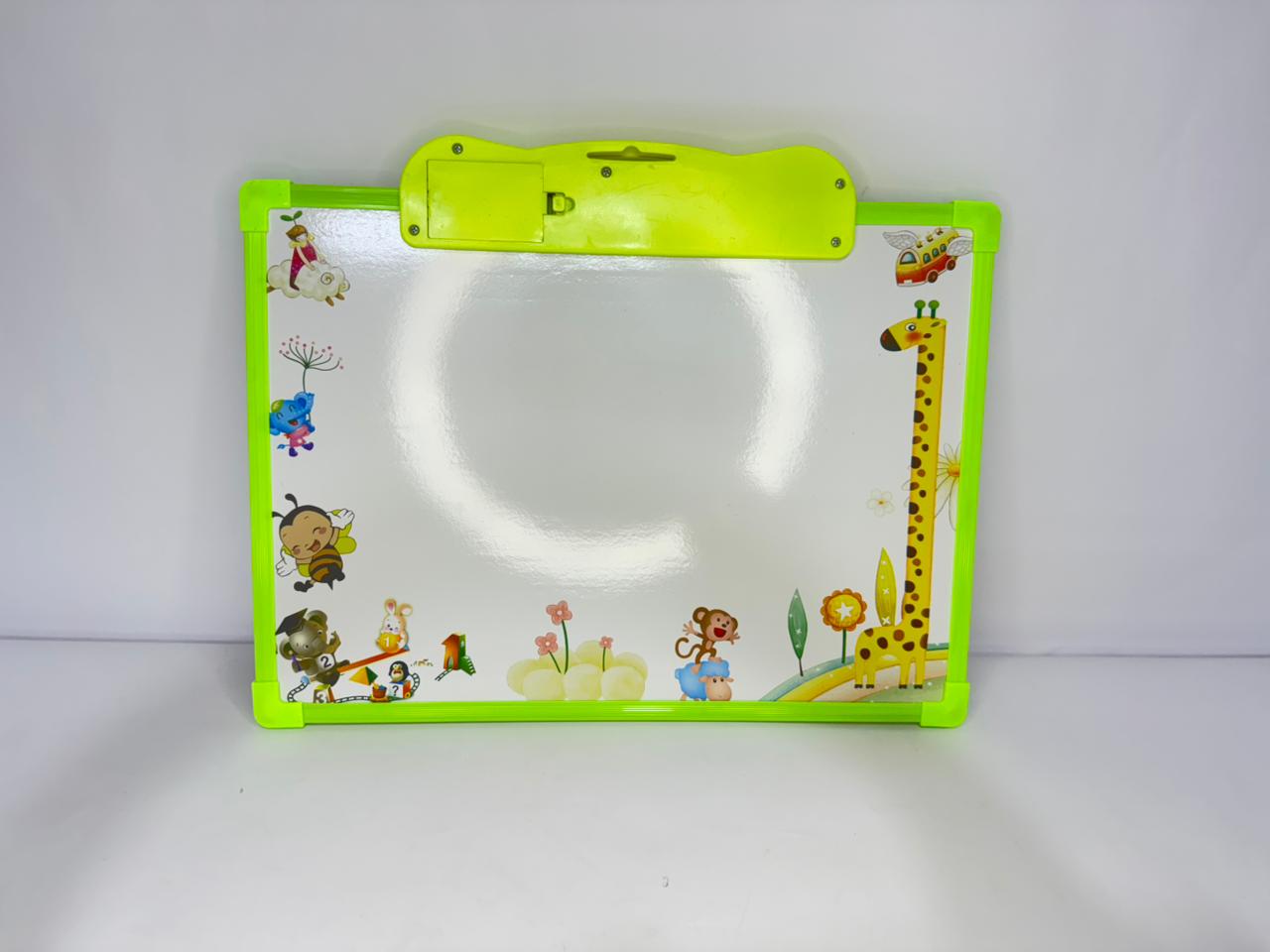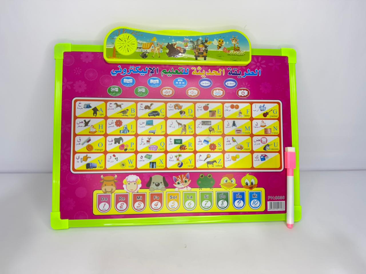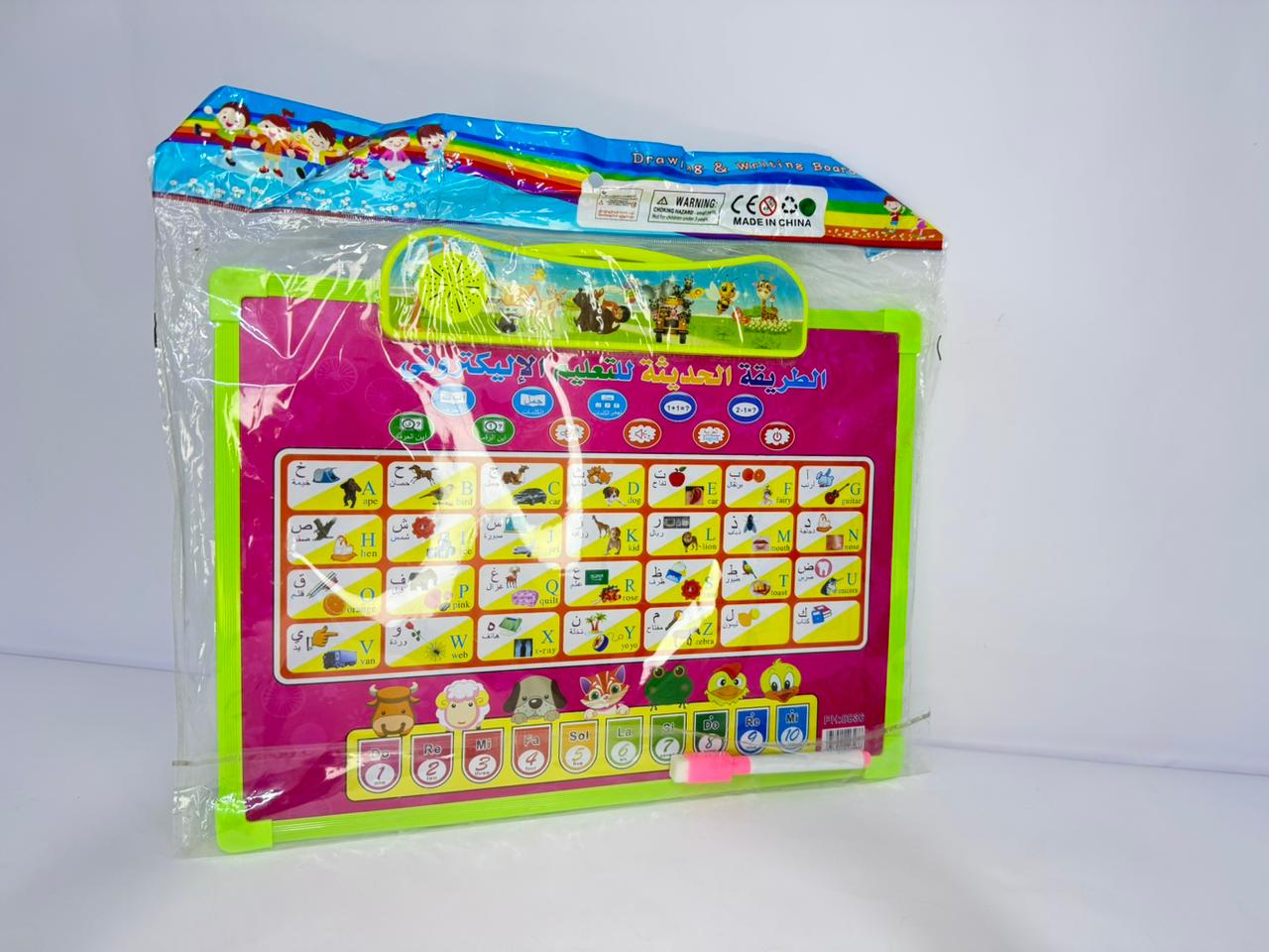 📦 محتويات اللعبة: لوحة إلكترونية ملونة تحتوي على الحروف العربية، الكلمات المصورة، أزرار للأناشيد والأصوات، وقلم للكتابة والمسح.