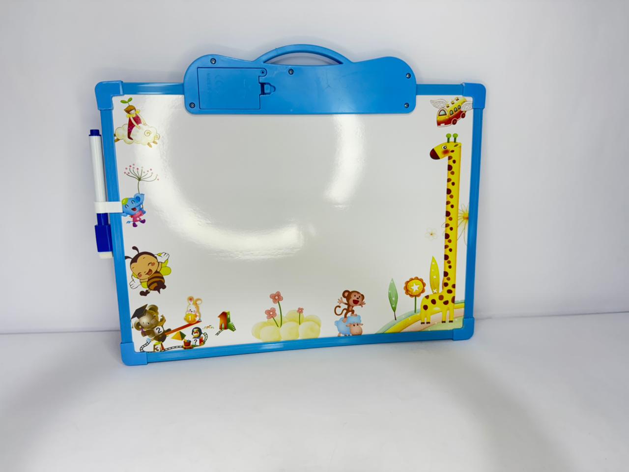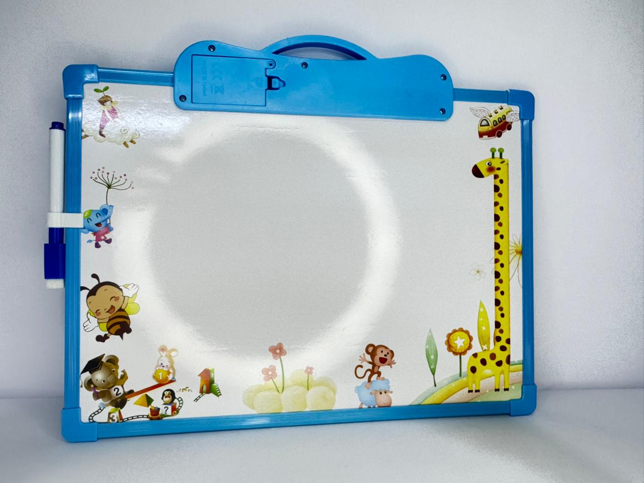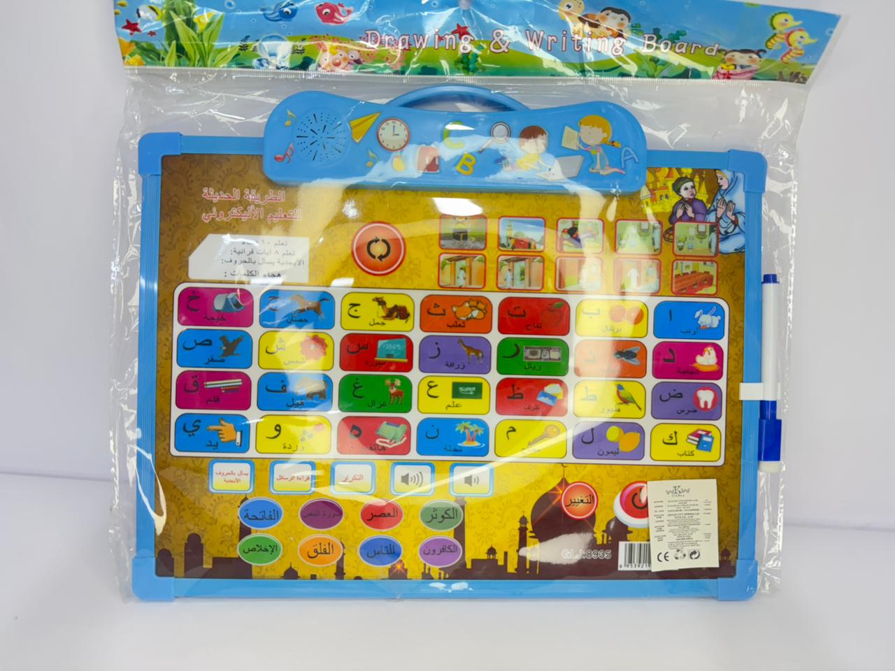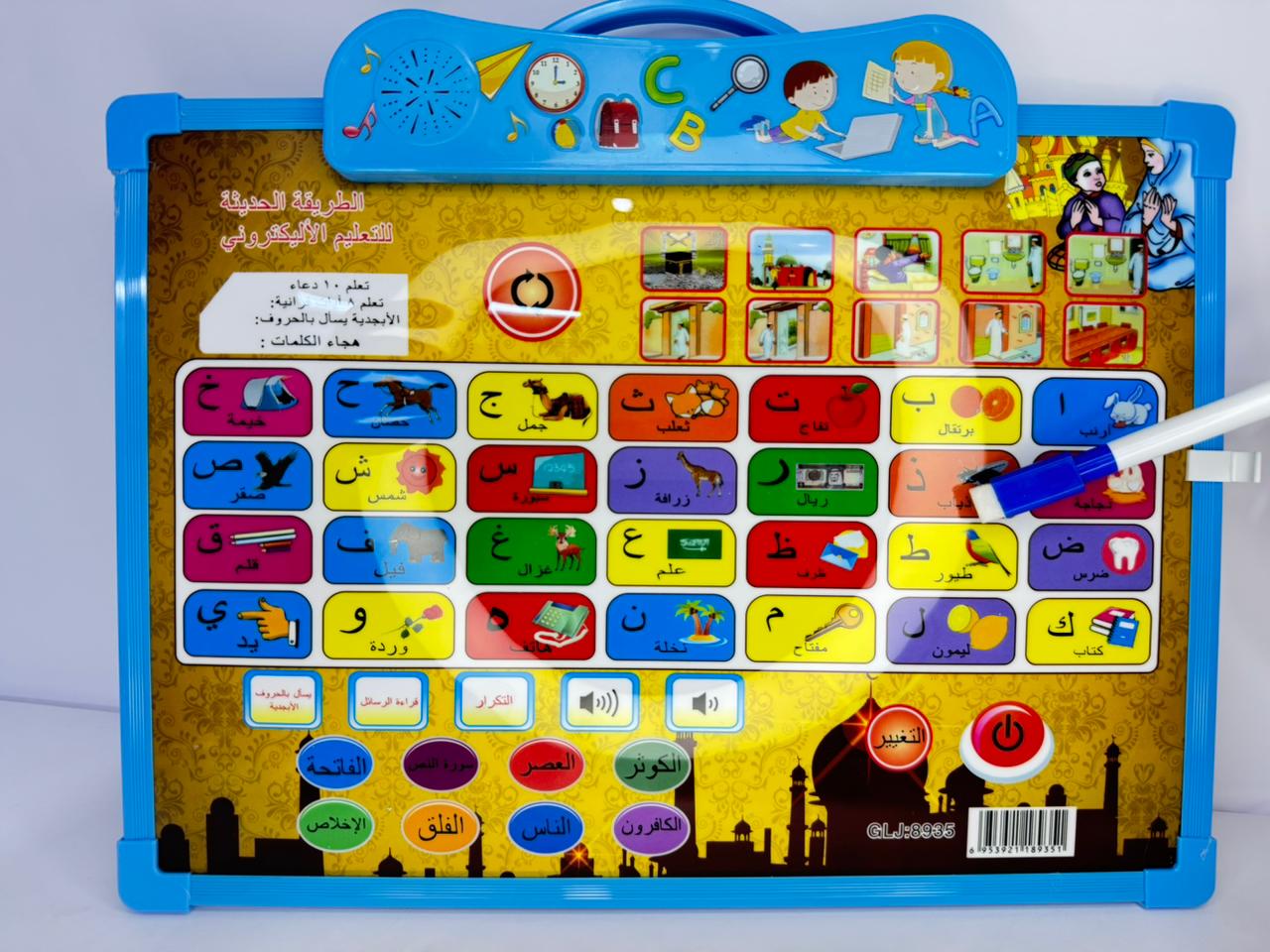 📦 محتويات اللعبة: لوحة إلكترونية ملونة تحتوي على الحروف العربية، الكلمات المصورة، أزرار للأناشيد والأصوات، وقلم للكتابة والمسح.