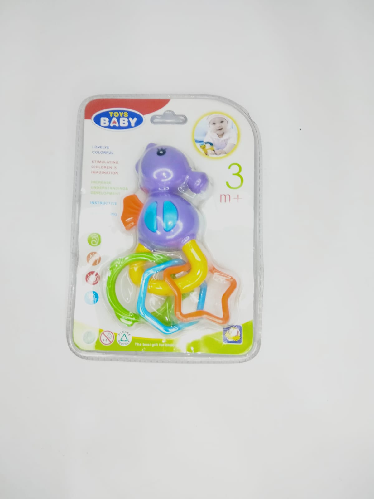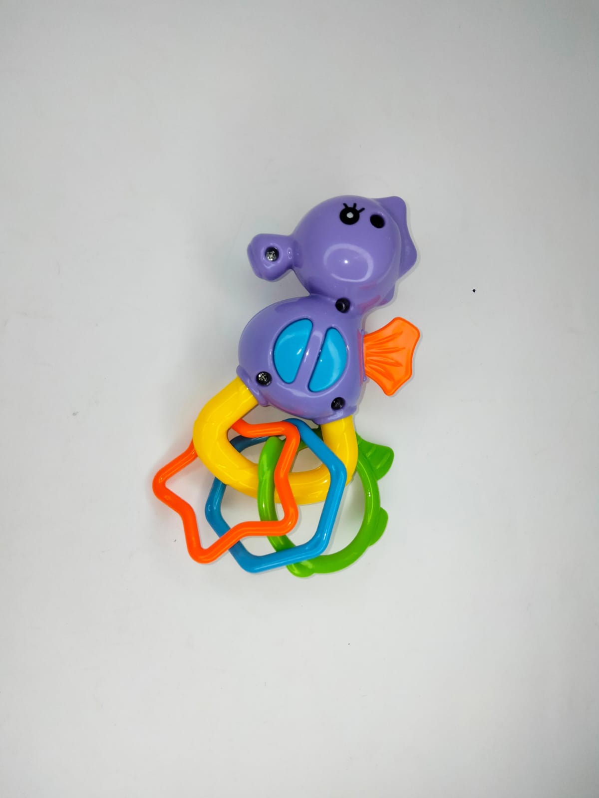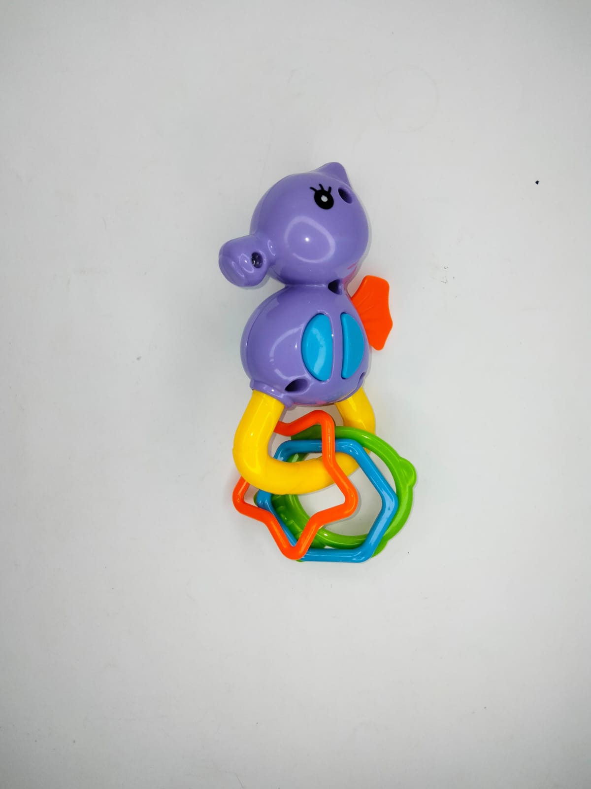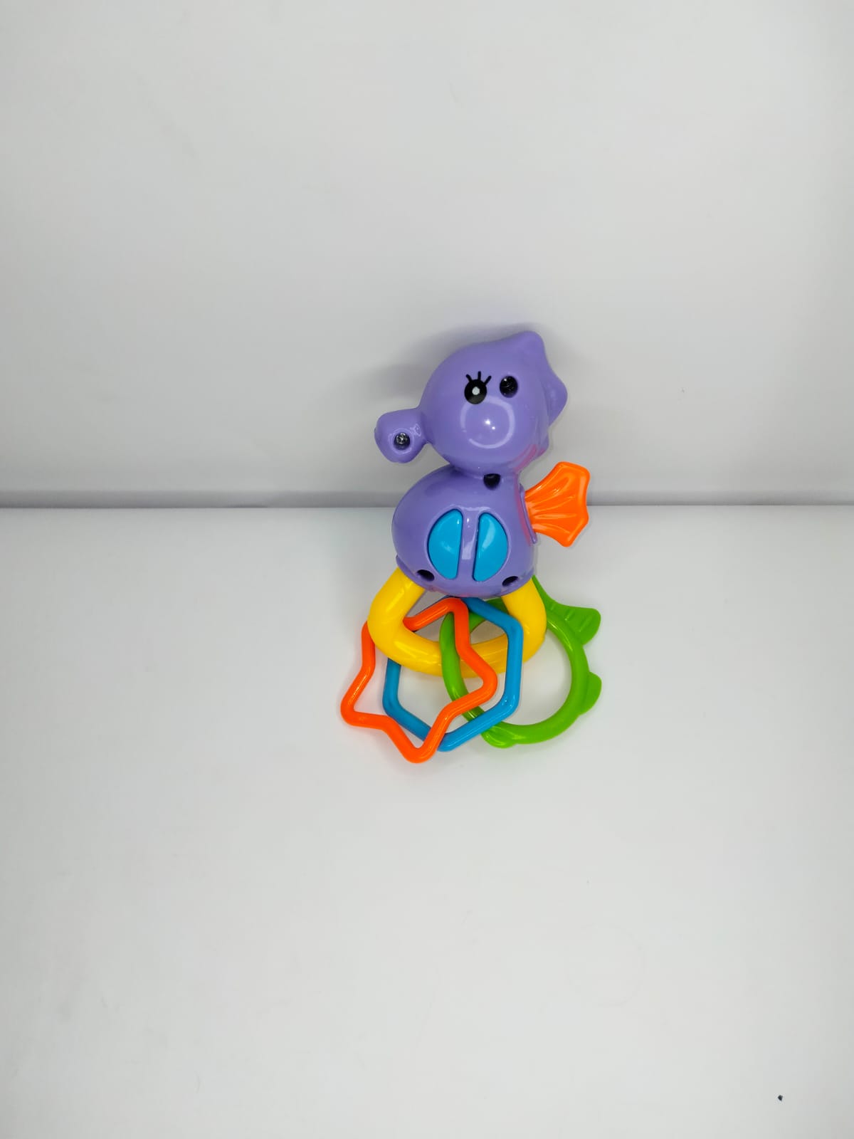محتويات اللعبة: حصان بحر بلاستيكي ملون مزوّد بعدة حلقات بأشكال وألوان مختلفة.