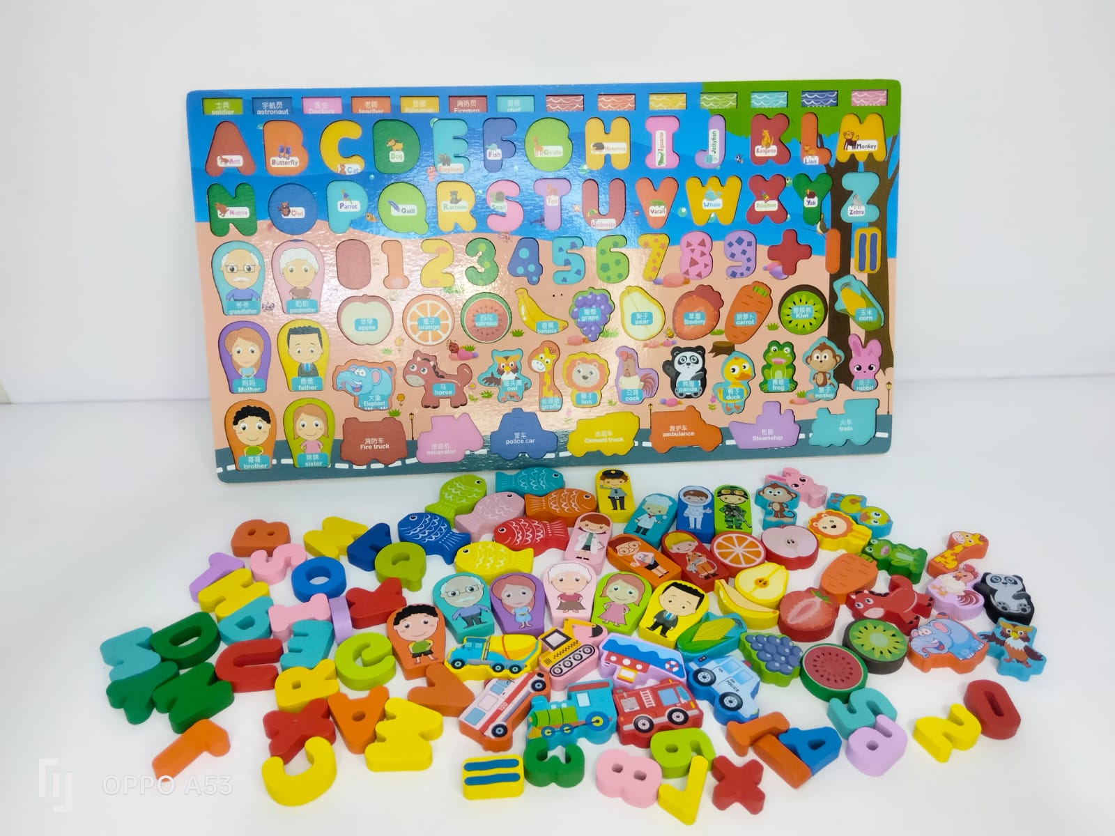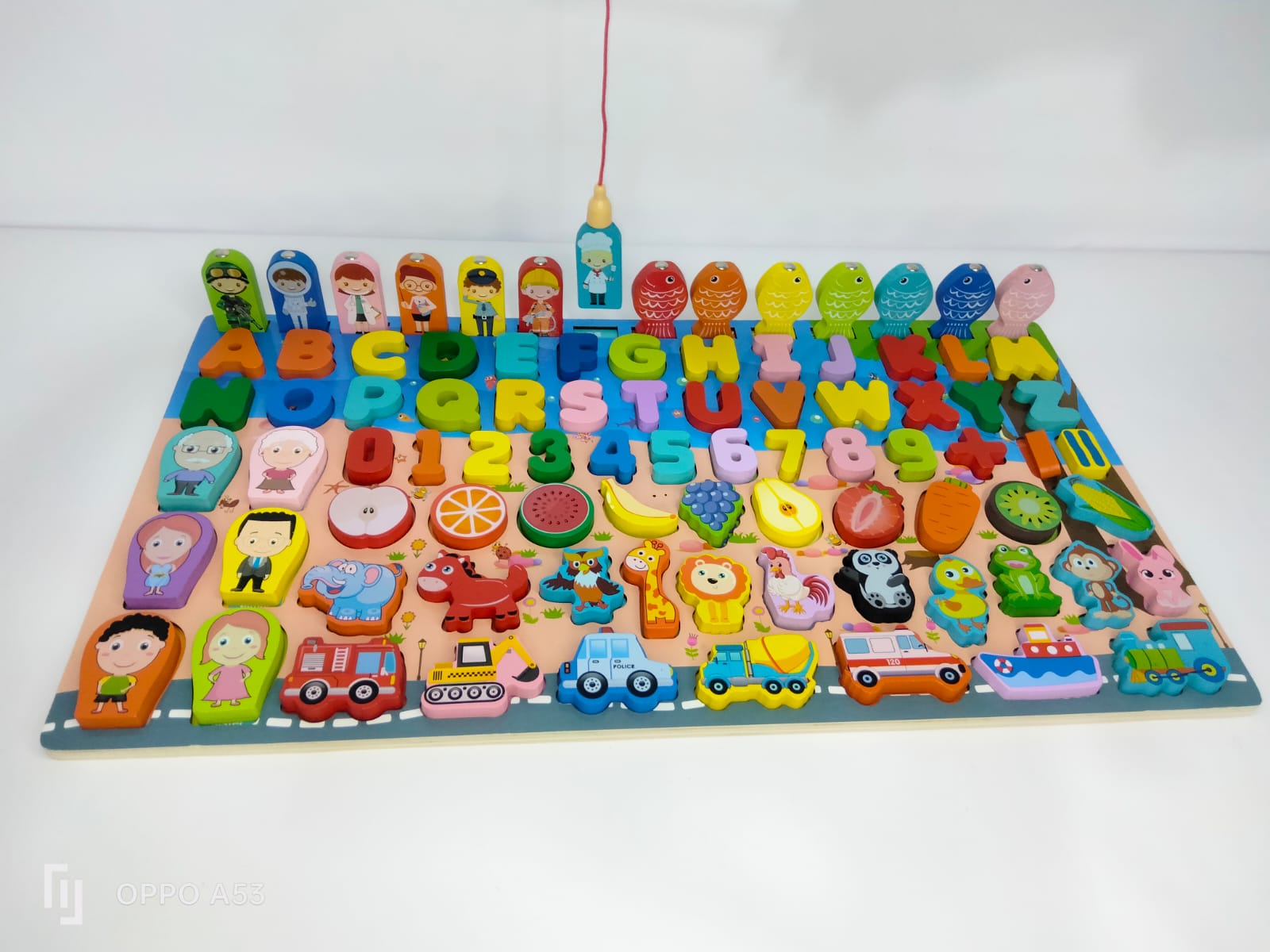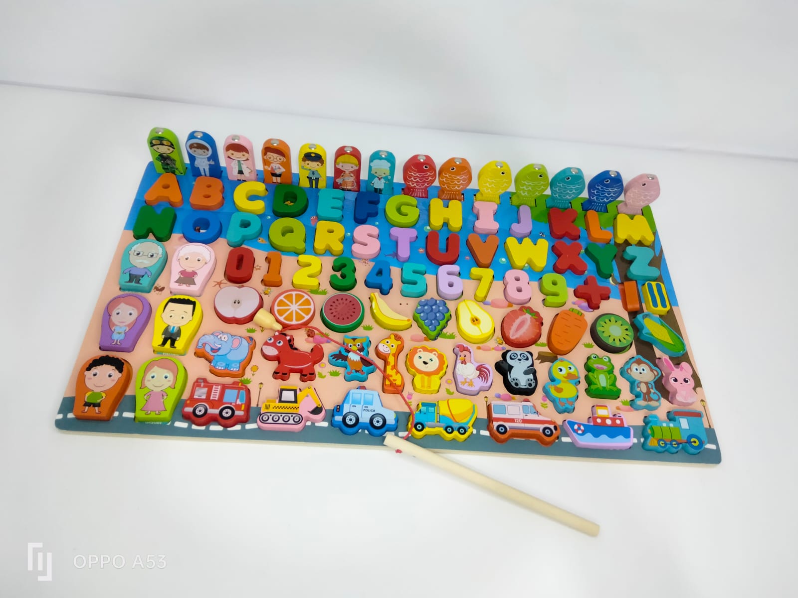 الطفل بيركب القطع في أماكنها الصحيحة على اللوحة، يتعلم الحروف والأرقام، ويستمتع باللعب التخيلي مع الحيوانات والأشكال، وكمان يقدر يلعب لعبة صيد السمك المغناطيسي.
