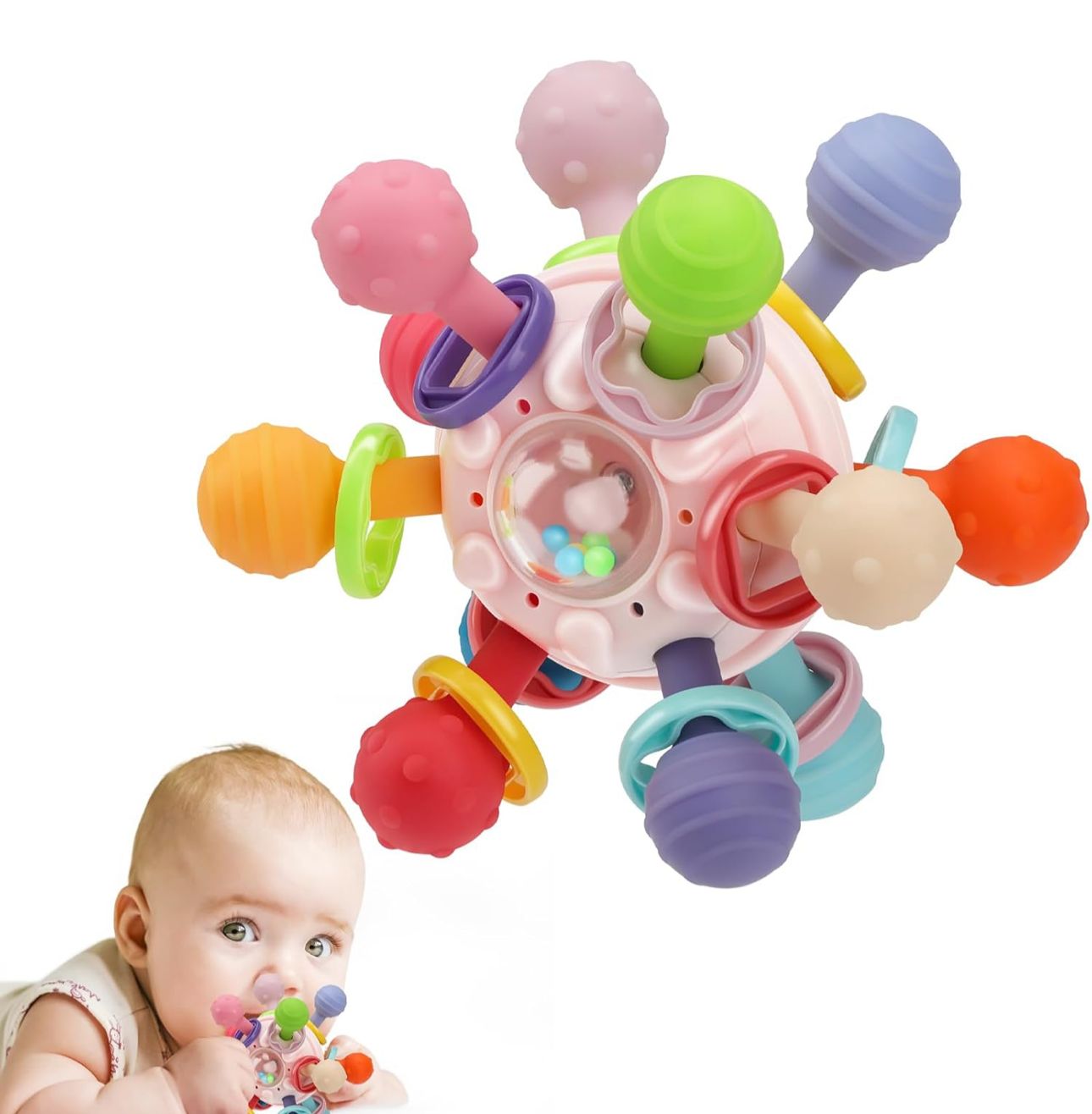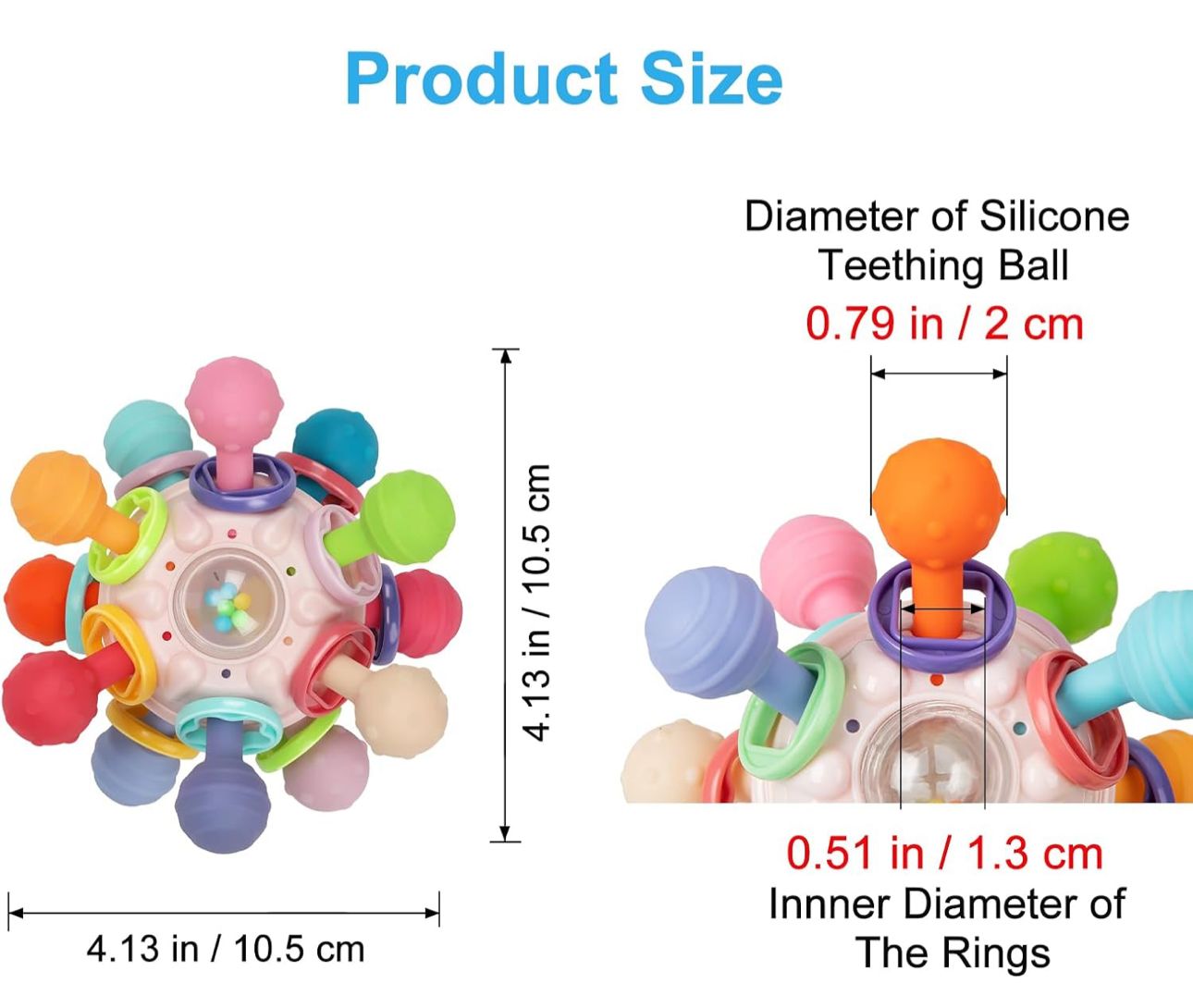 طريقة الاستخدام: يمكن للطفل إمساك الكرة بسهولة، هزّها لسماع الأصوات، استكشاف الملمس المختلف لكل ذراع، تحريك الحلقات، أو استخدامها كلعبة للتسنين عن طريق العض بأمان.
