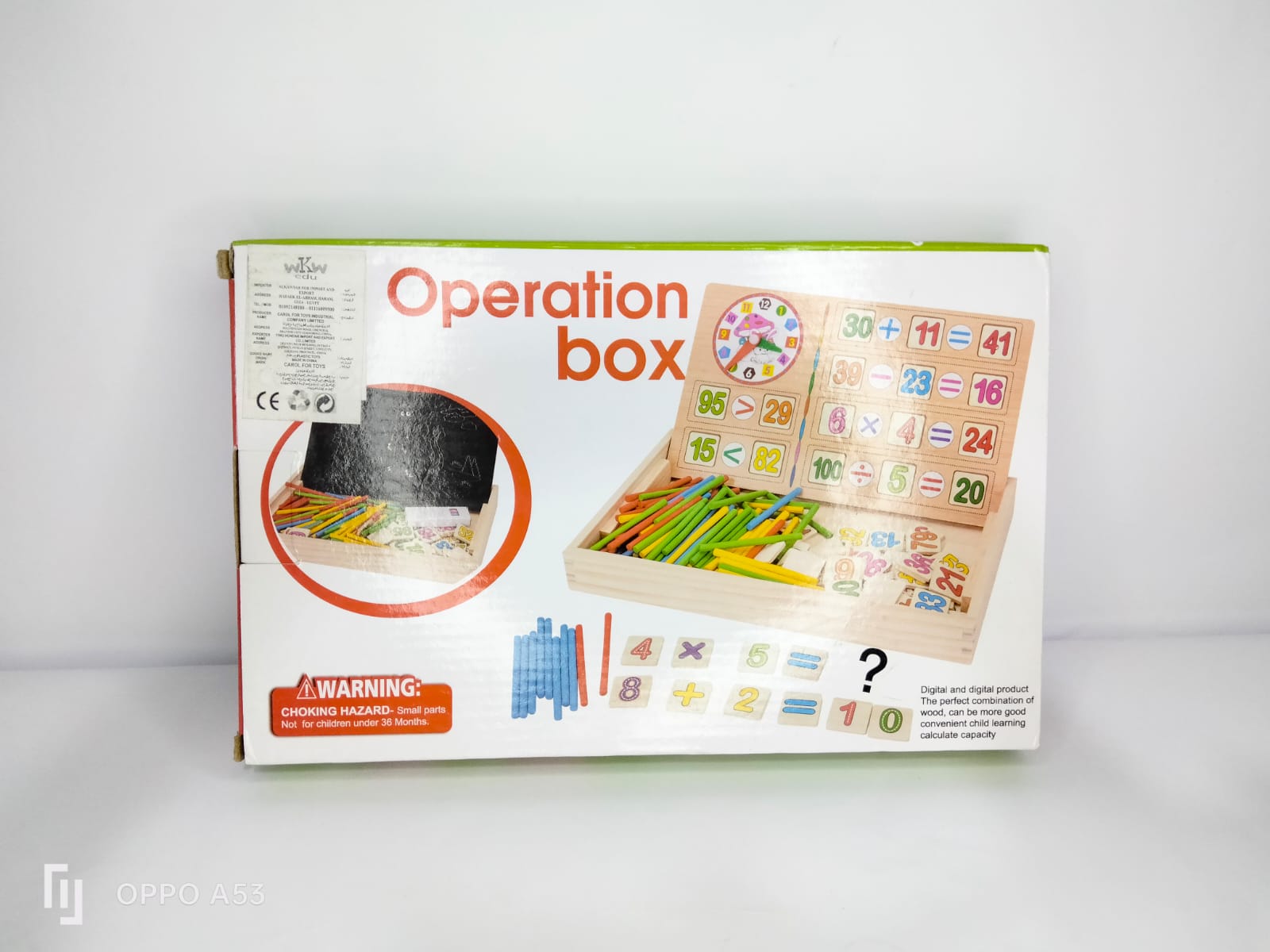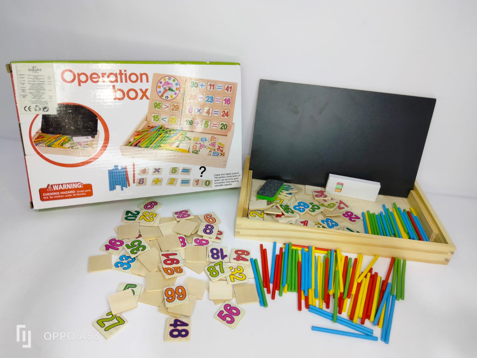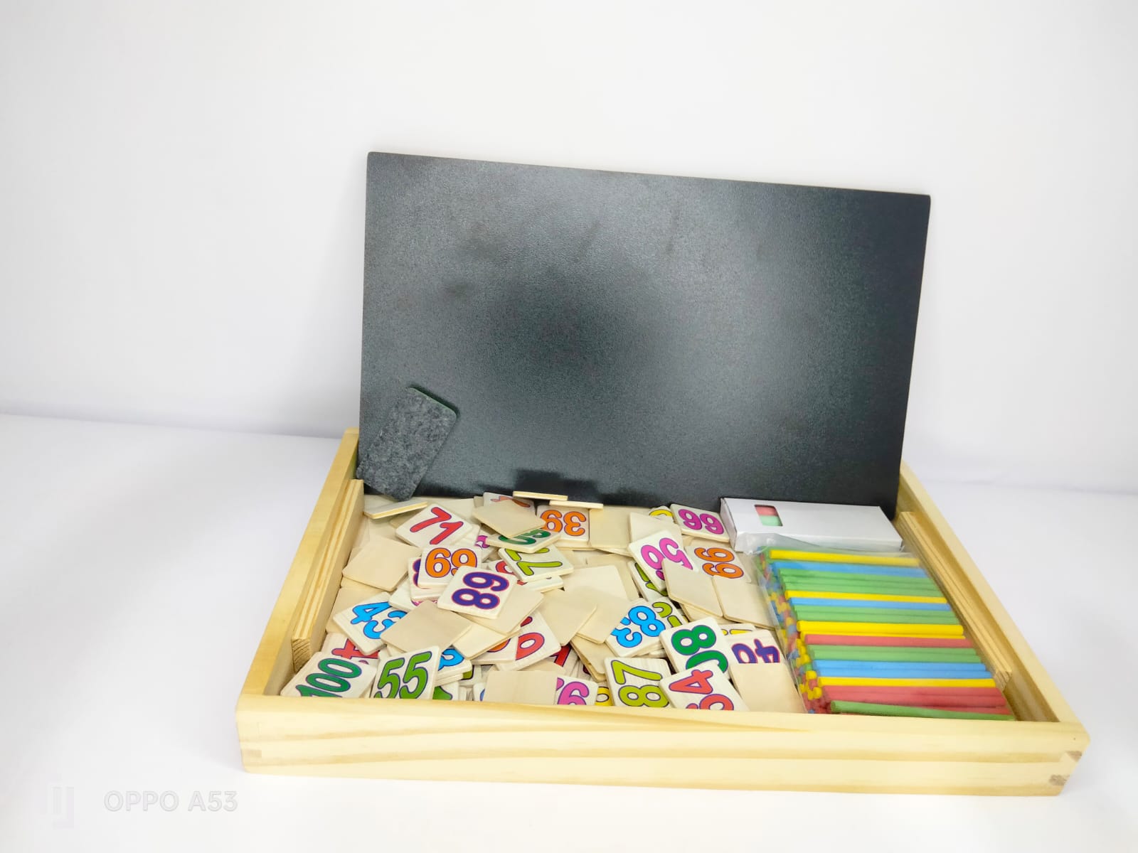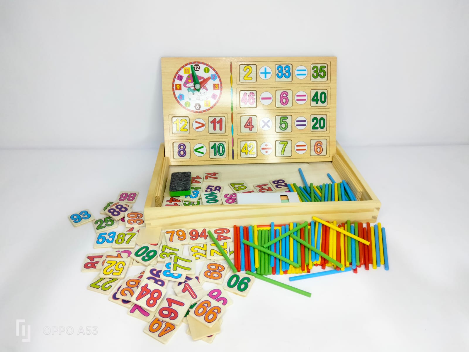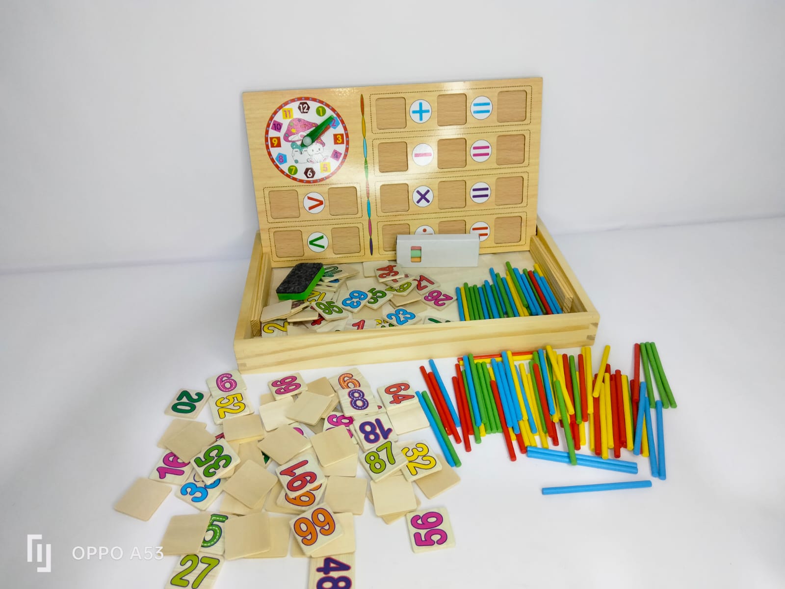 📦 محتويات اللعبة: لوحة خشبية بأرقام ورموز رياضية ملونة + أعواد عد ملونة + بطاقات مكعبات للتدريب على العمليات الحسابية.