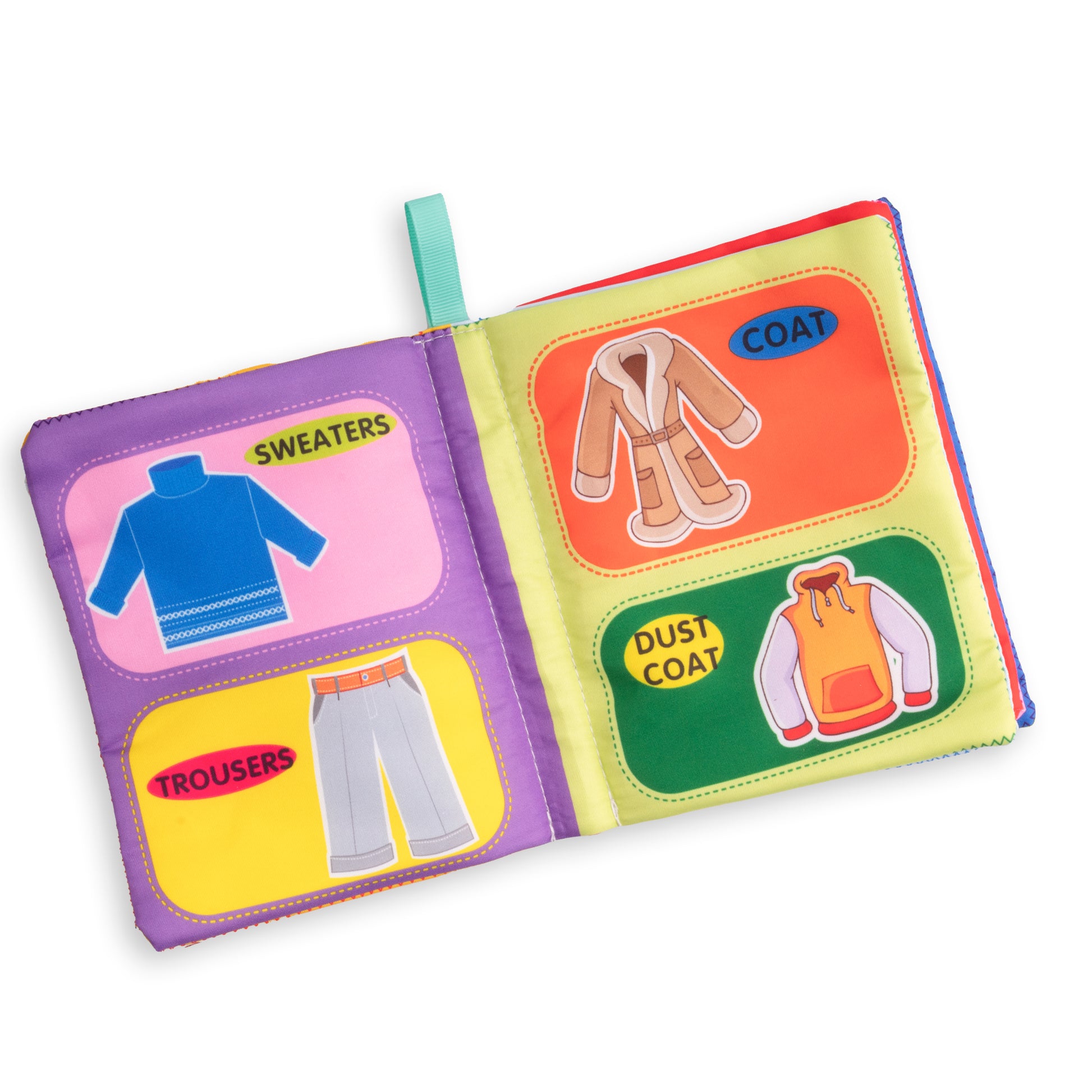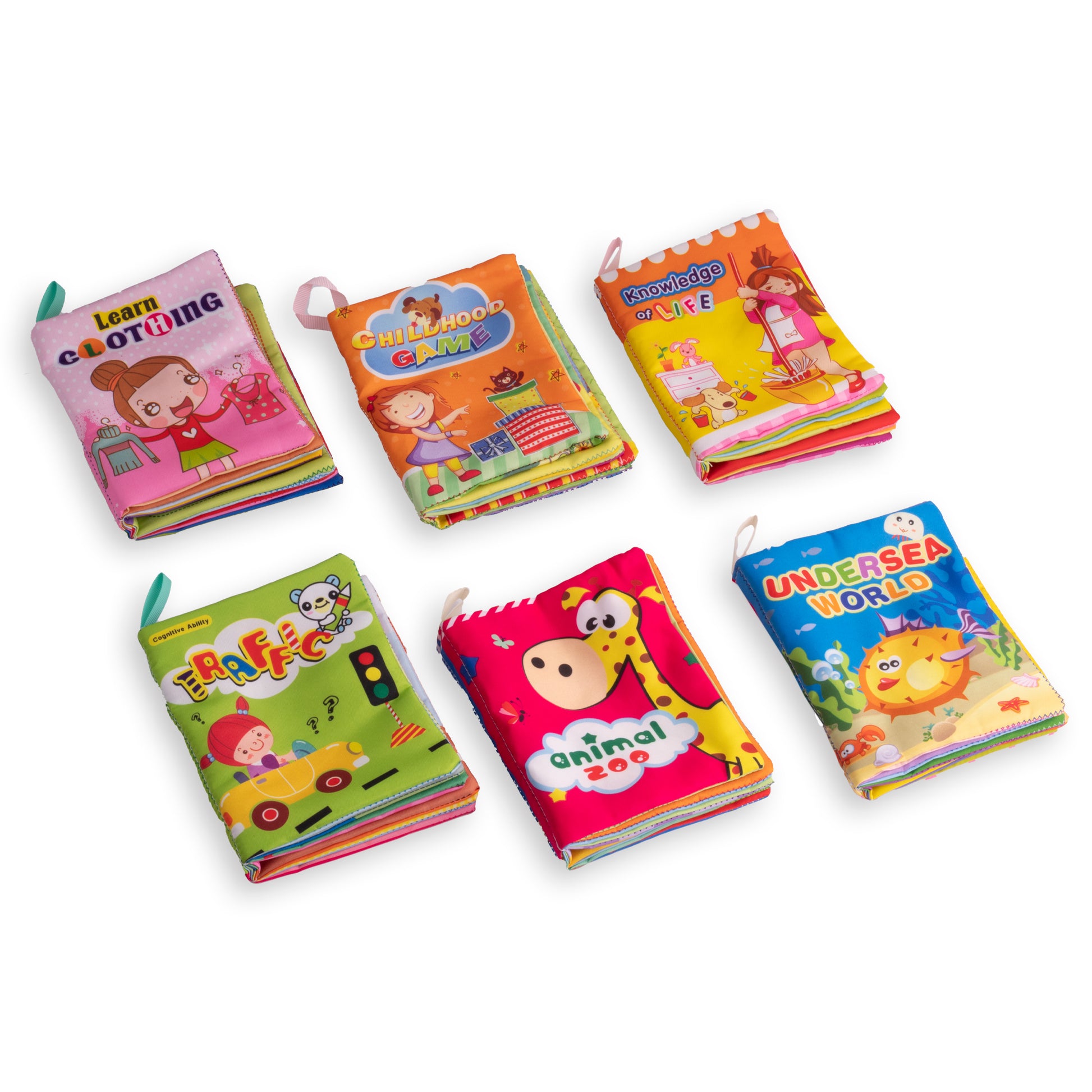 - 6 كتب قماشية متنوعة المواضيع (حيوانات، ألوان، فواكه، أرقام، أشكال... وغيرها)