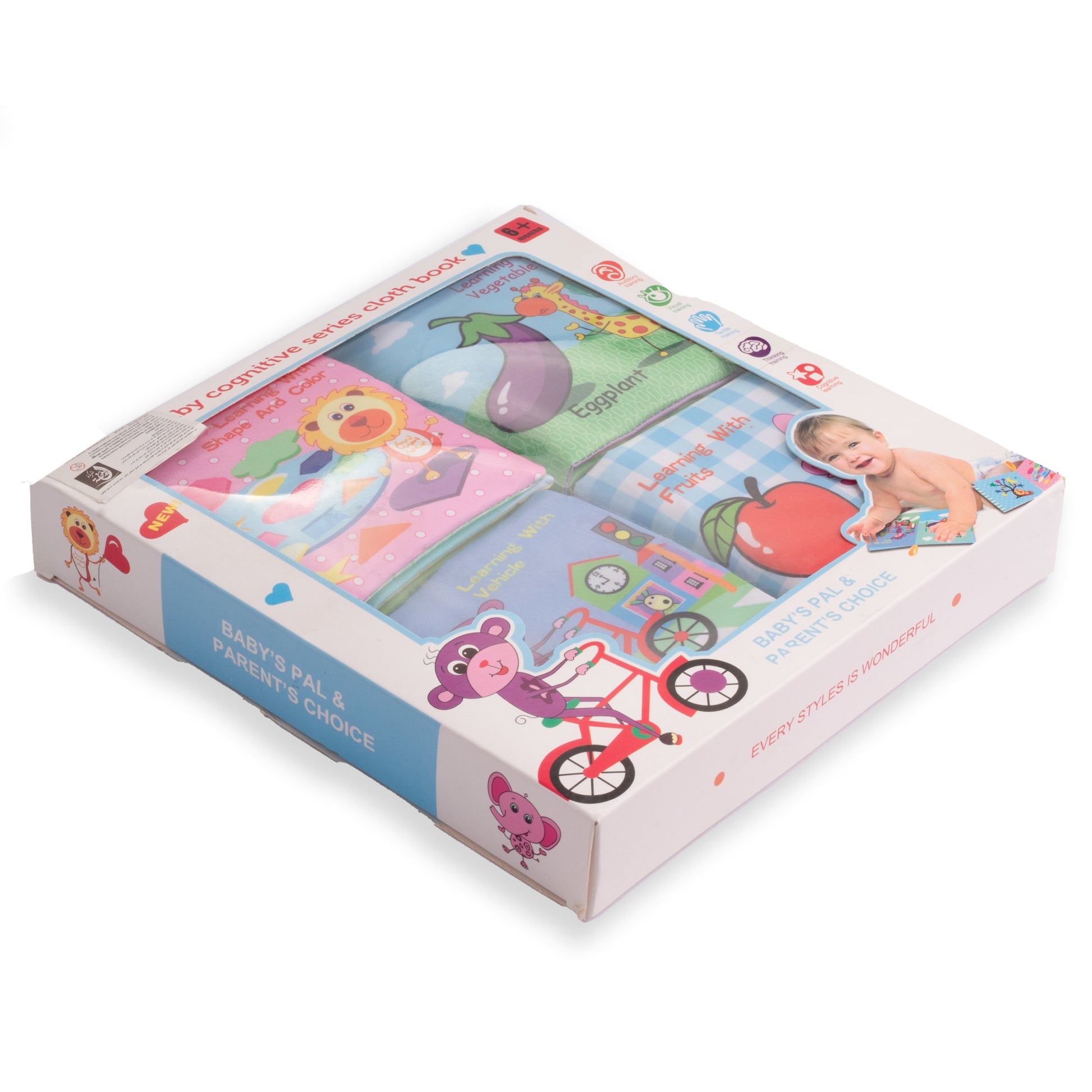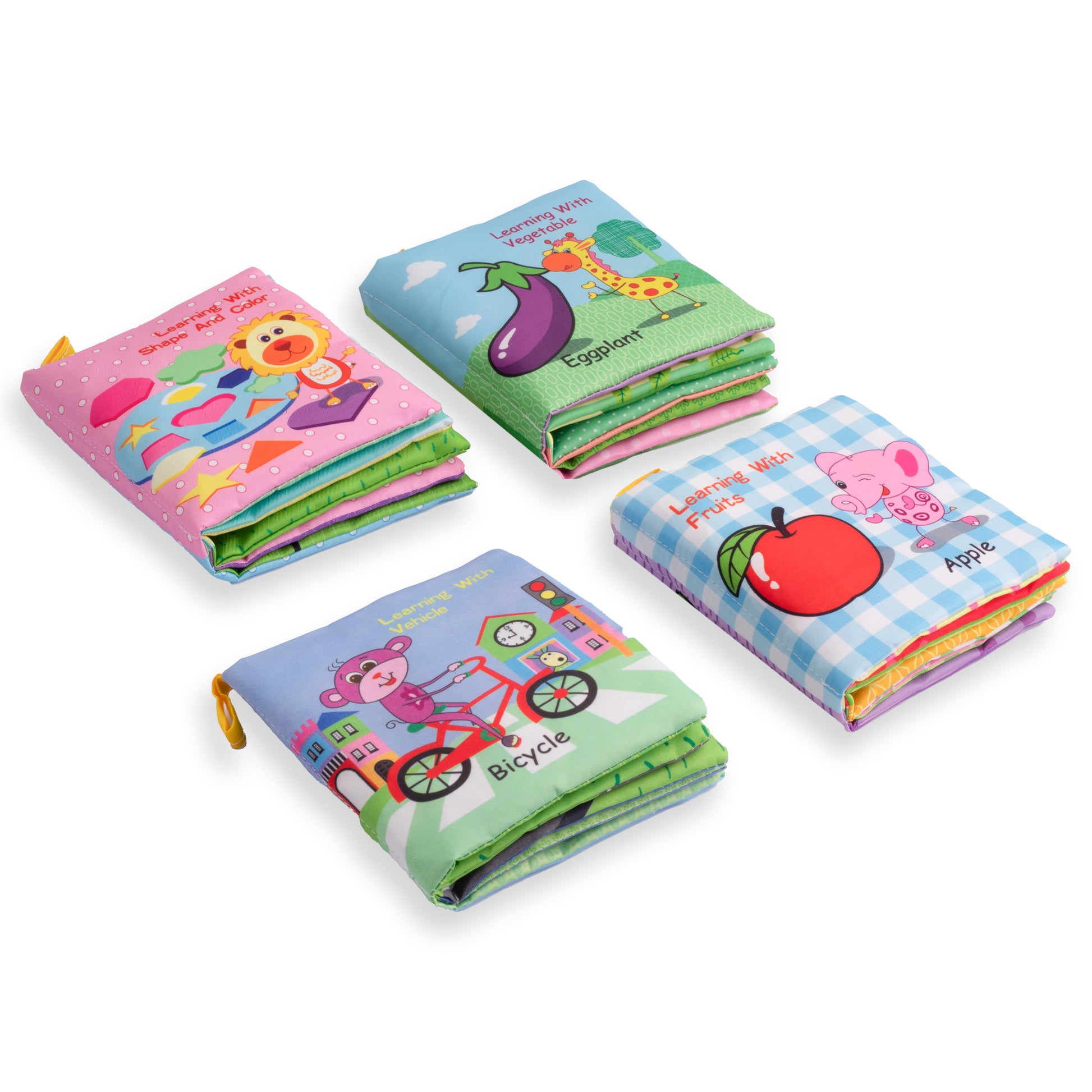 - 4 كتب قماشية متنوعة المواضيع (حيوانات، ألوان، فواكه، أرقام، أشكال... وغيرها)