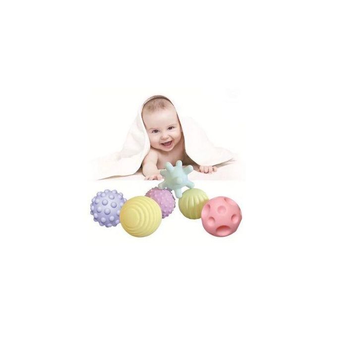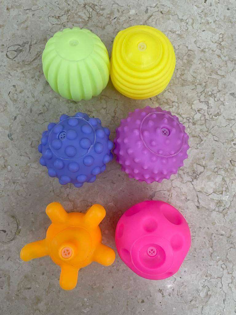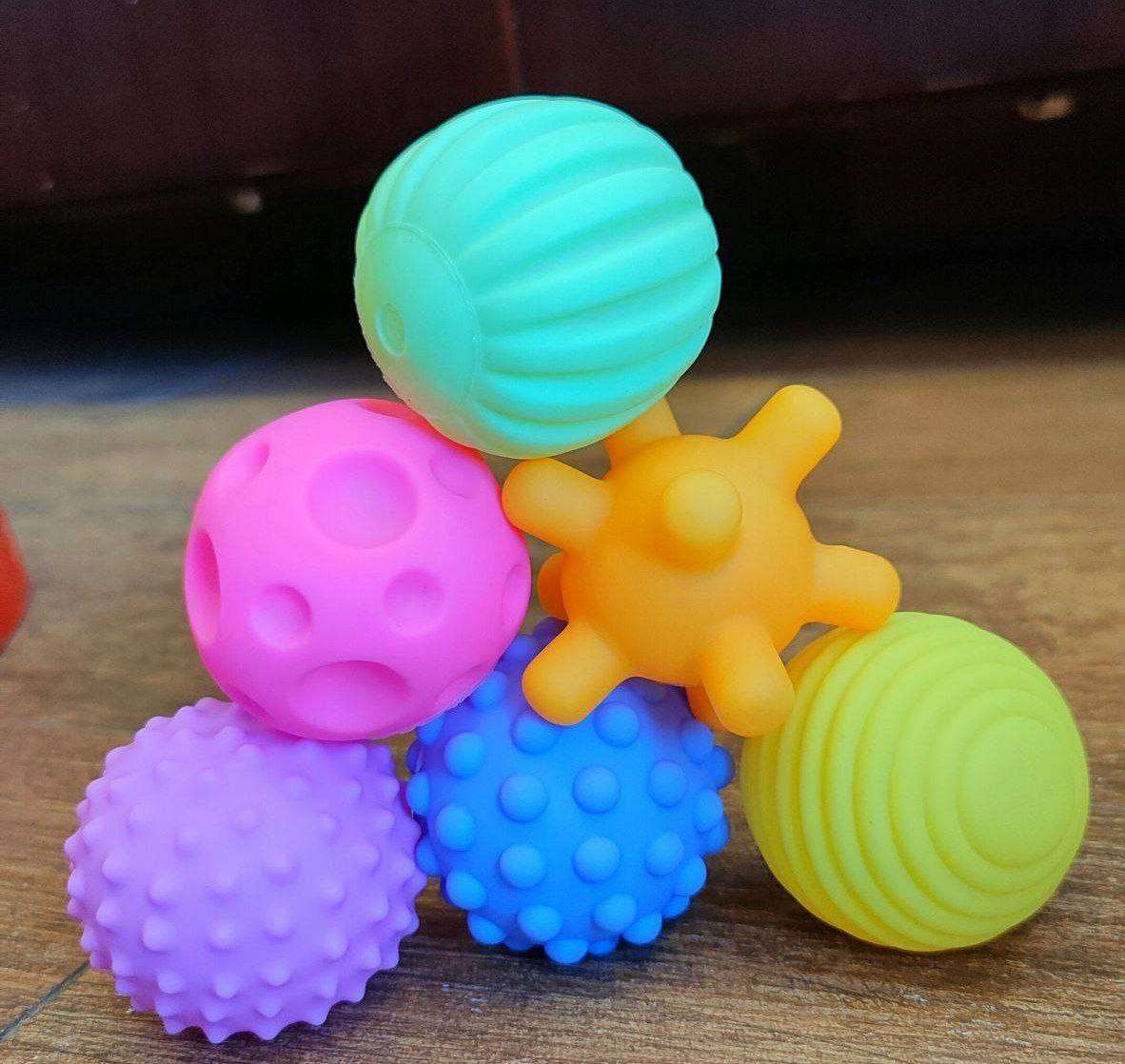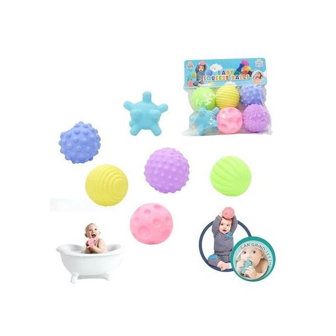 - 6 كرات سيليكون بألوان زاهية وأشكال متنوعة لتحفيز حواس الطفل وتطوير إدراكه البصري واللمسي
