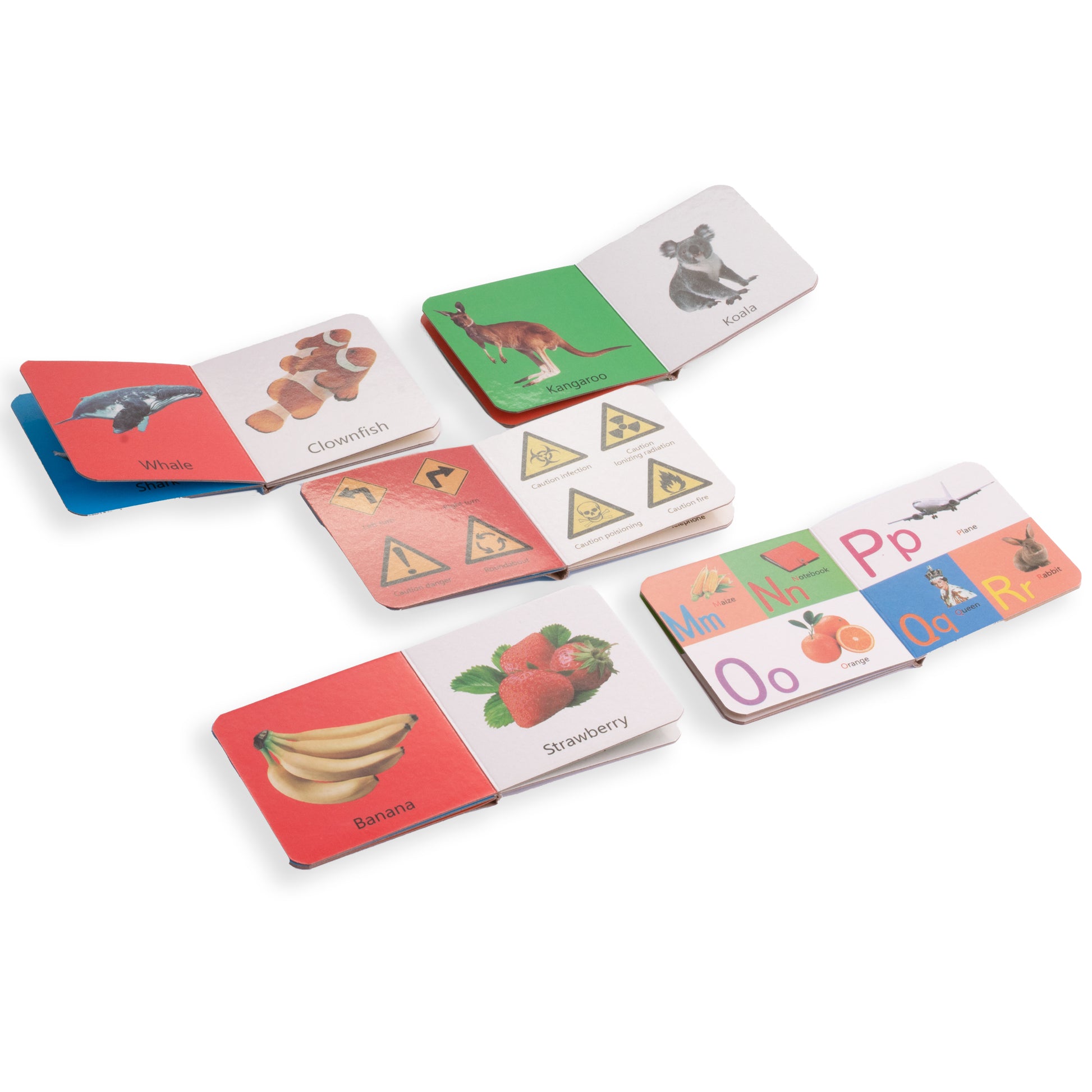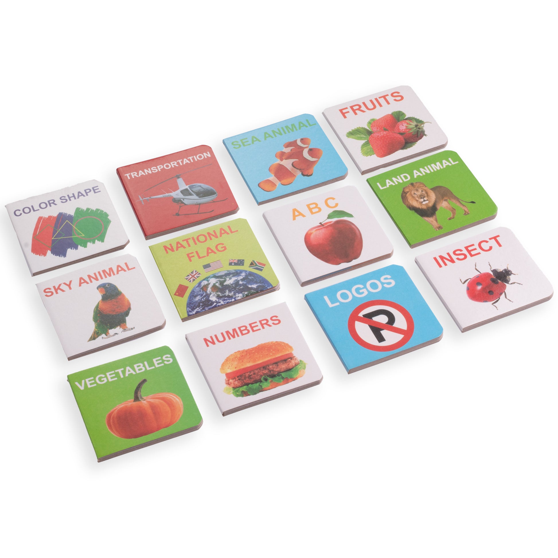 - تشمل بطاقات تعليمية ملوّنة تغطي مواضيع متنوعة: الحروف، الأرقام، الألوان، الحيوانات، الفواكه، وأكثر