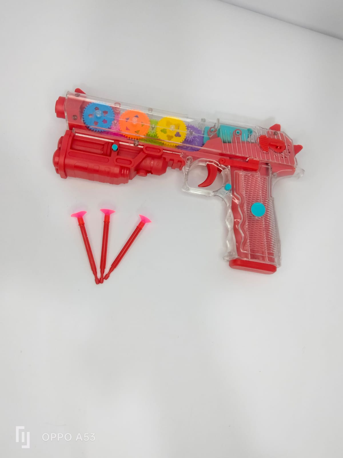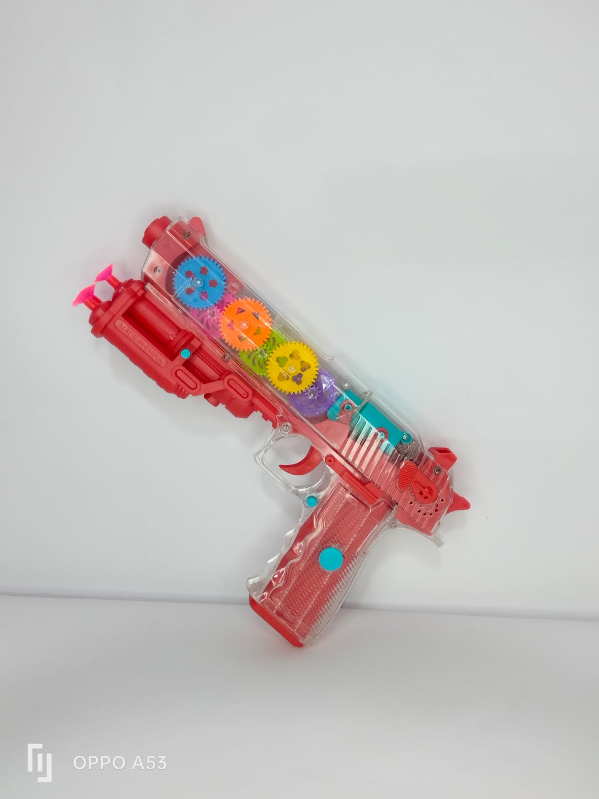 📦 محتويات اللعبة: مسدس بلاستيكي بتصميم عصري + تروس ملونة داخلية متحركة + مؤثرات ضوئية وصوتية.