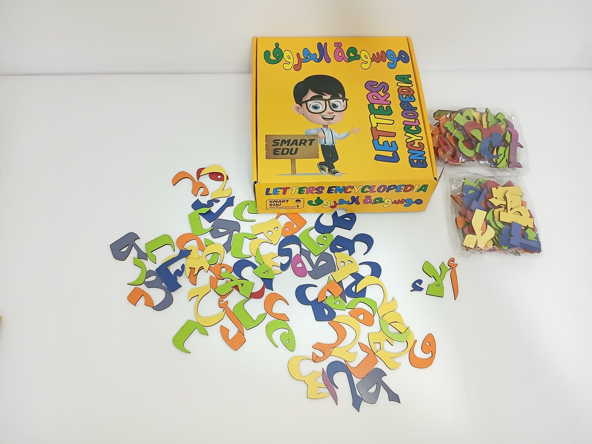 محتويات اللعبة: بطاقات تعليمية ملونة للحروف + صور توضيحية مرتبطة بكل حرف.