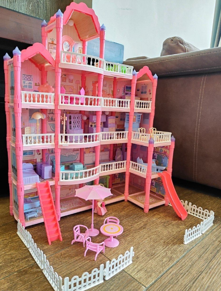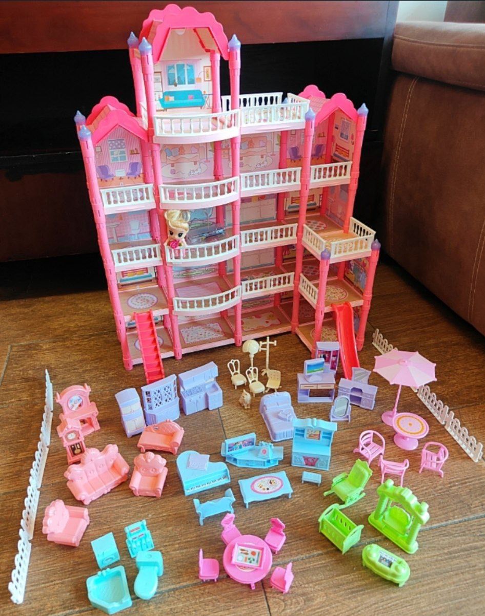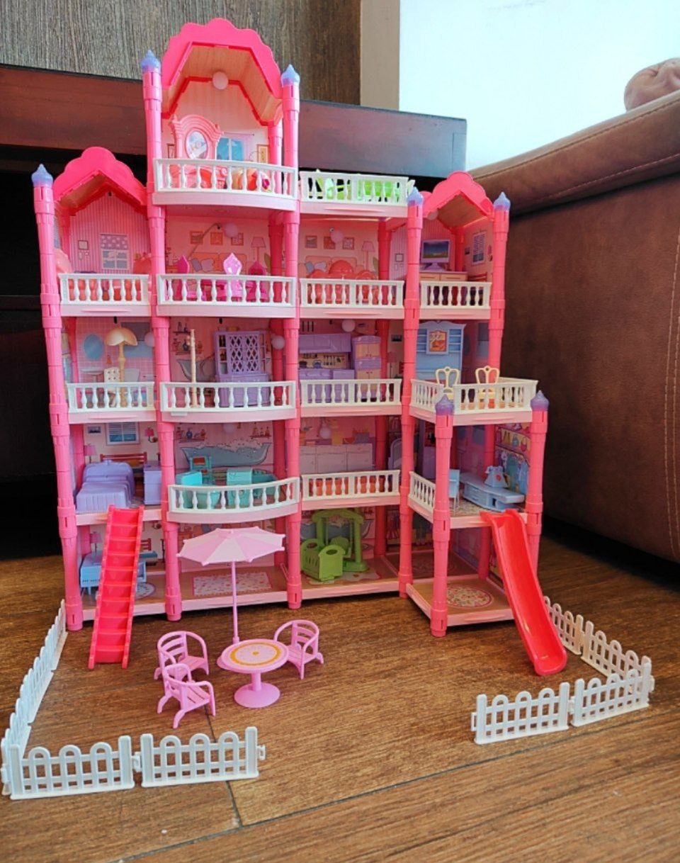 🧡 فيها كل الغرف وكل غرفه بلون مختلف المطبخ والحمام و الليفينج و النوم وغرفه الموسيقى وفيها سفره وكراسي هزاز و ترابيزه تلفزيون و شاشه كمبيوتر وتلفزيون وتليفون ارضي و 2 بيانو وسرير هزار بيجي كمان معاها مرجيحه وسلم وزحليقه وحاجات كتير اوي