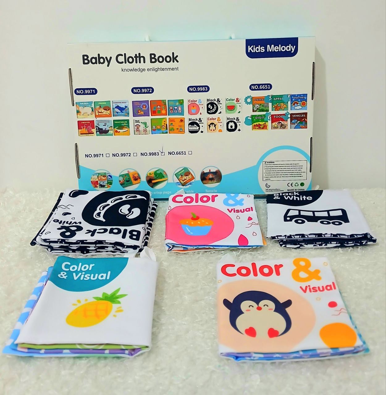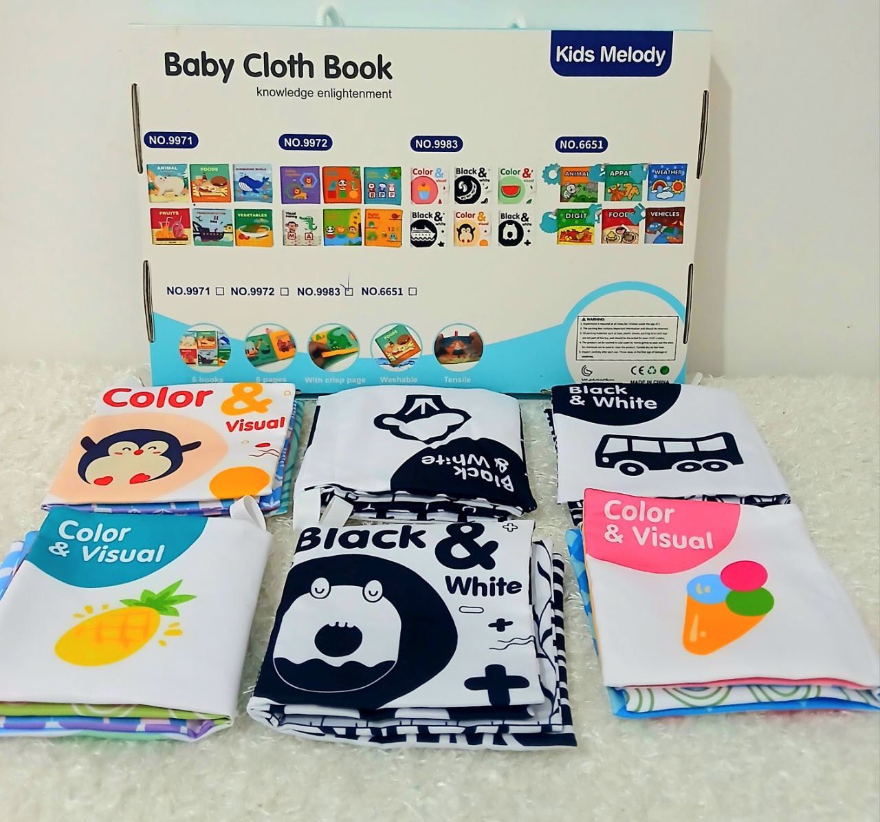 مجموعه 6كتاب أبيض وأسود لحديثي الولادة حيث تكون الرؤية ضبابية ومن ثمَّ فإنّ الصور ذات التباين العالي، خصوصا الأبيض والأسود، في الشهور الأولى تدعم التطور البصري، كما تساعد على تطوير قدرتهم على التركيز وزيادة مدى الانتباه،