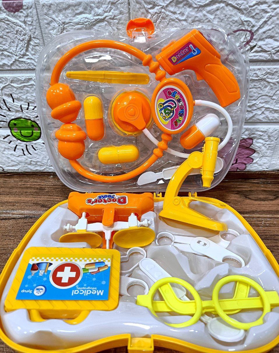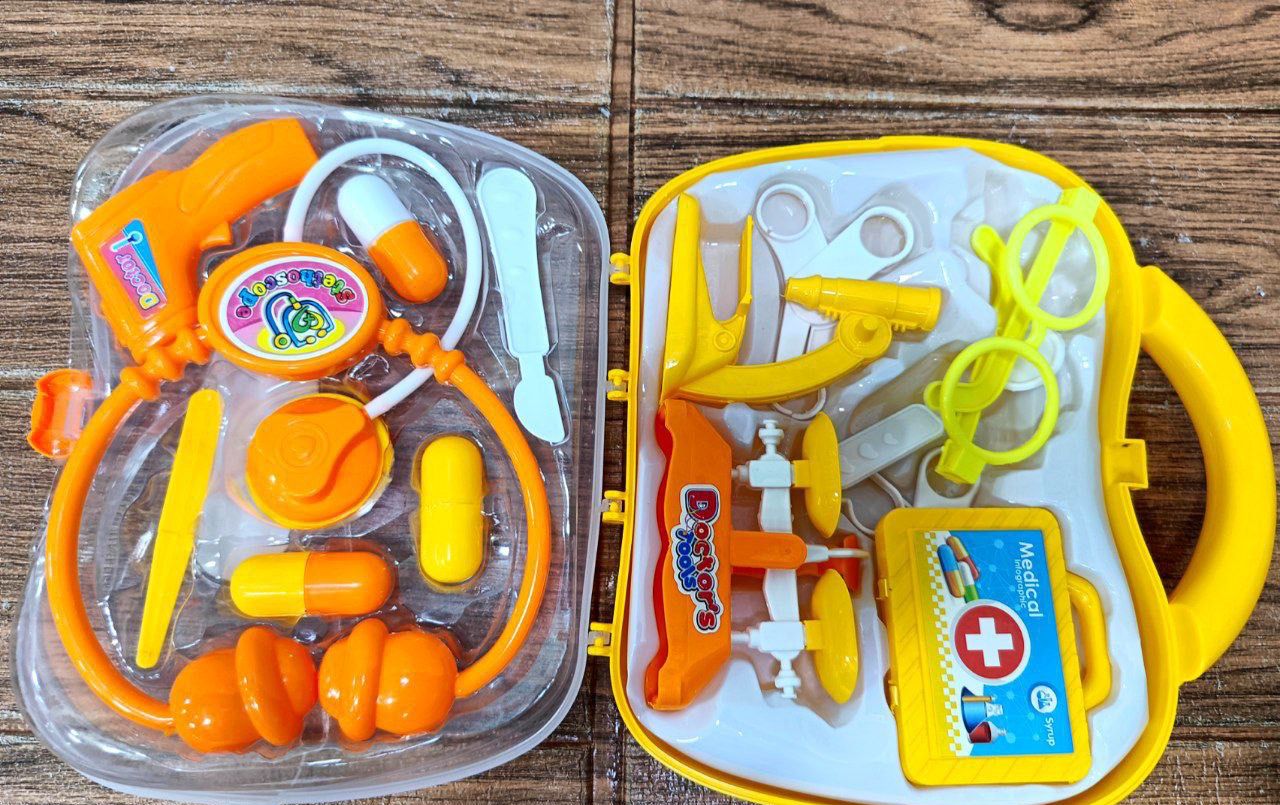 🔹 فيها أدوات دكتور كاملة: سماعة 🩺، حقنة 💉، ترمومتر 🌡️ وحاجات تانية كتير.